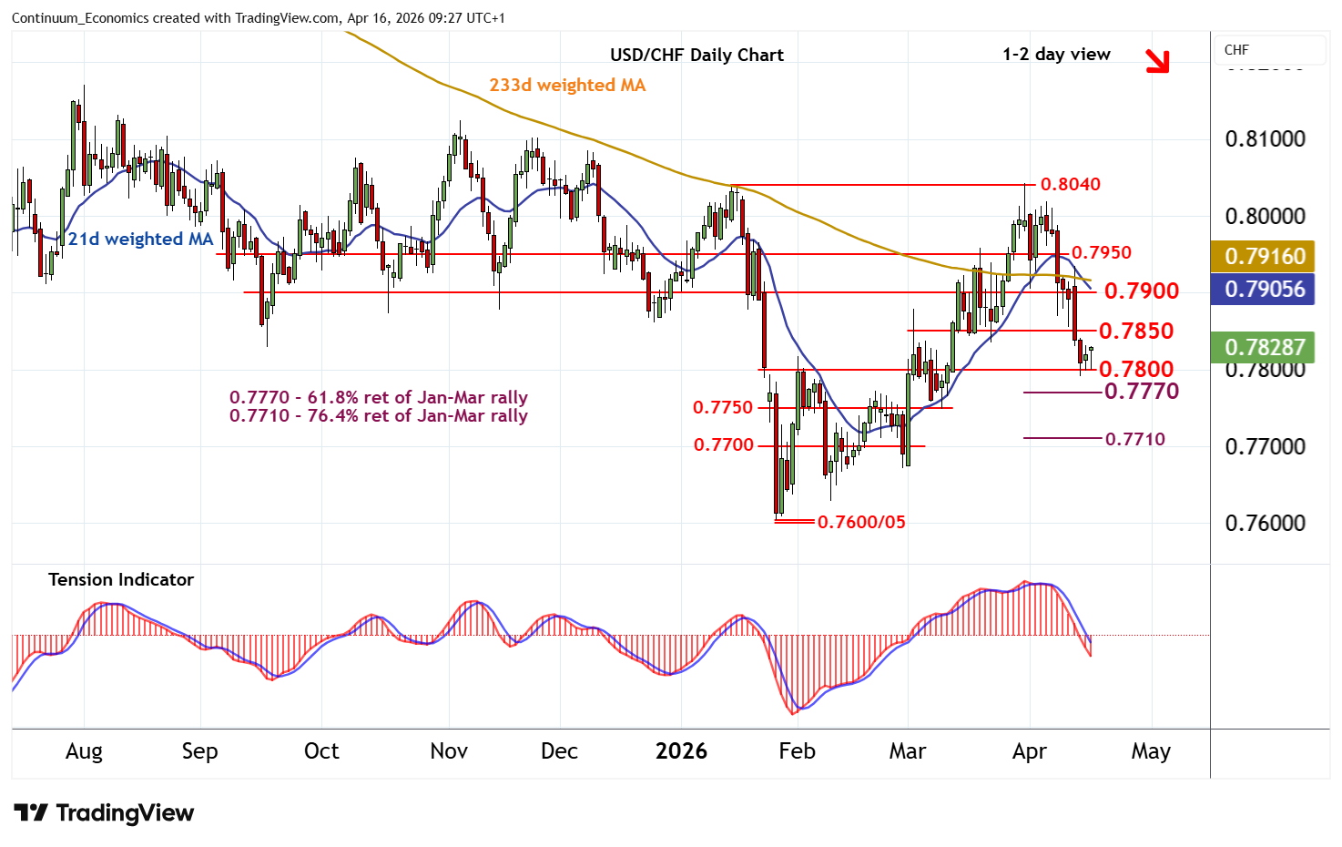 09:20 BST - Little change, as prices extend consolidation following the test of congestion support at 0.7800. Rising intraday studies and a tick higher in oversold daily stochastics highlight room for a minor bounce. But the negative daily Tension Indicator and bearish weekly charts should limit scope in renewed selling interest towards congestion resistance at 0.780. Following cautious/corrective trade, fresh losses are looked for. A close below 0.7800 will add weight to sentiment and extend late-March losses below the 0.7770 Fibonacci retracement towards congestion around 0.7750. Still lower is 0.7700/10, where more significant short-covering/consolidation could develop.