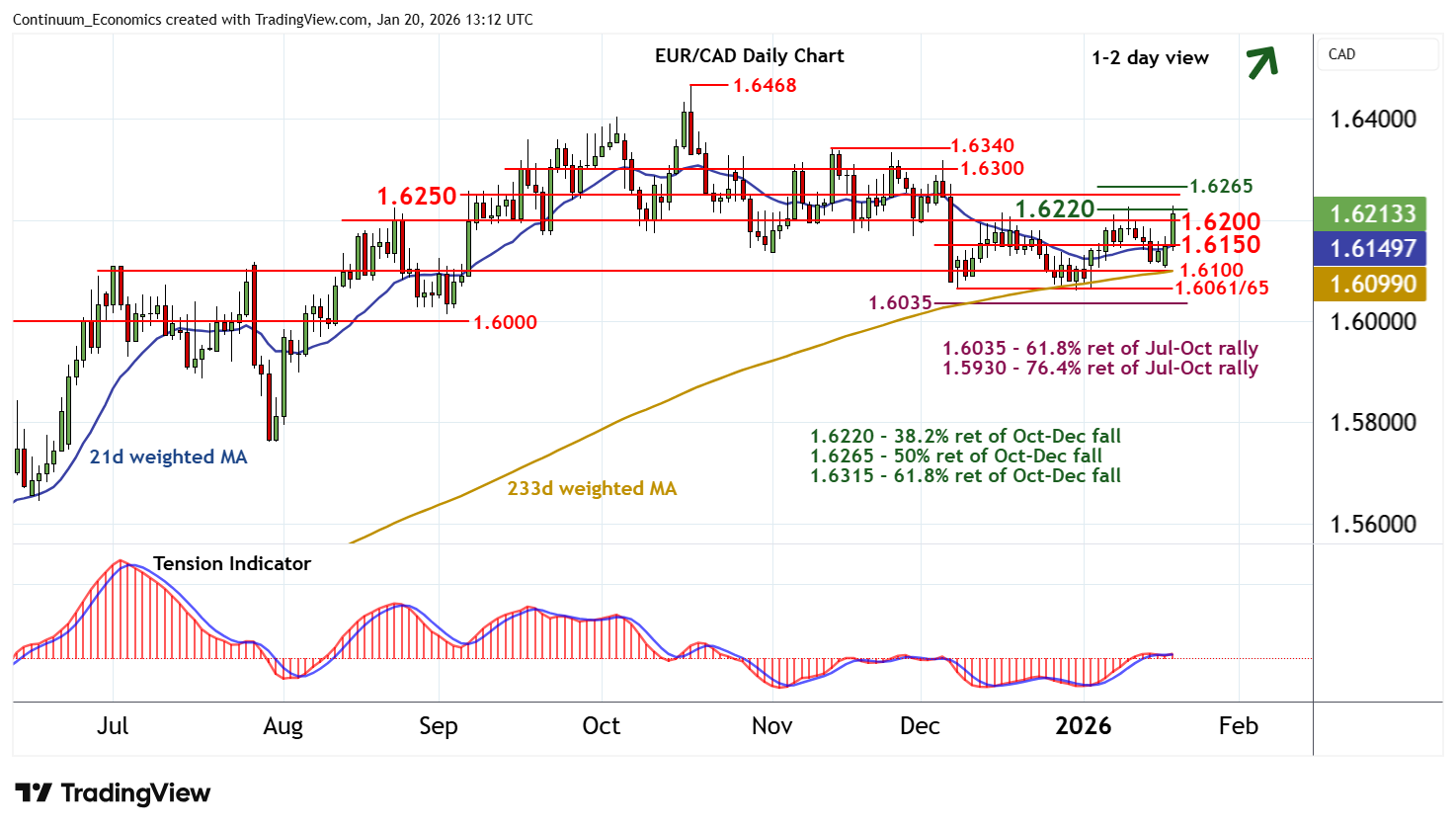 12:40 GMT - Cautious trade has given way to the anticipated test higher, as intraday studies continue to rise, with prices currently pressuring resistance within congestion around 1.6200 and the 1.6220 Fibonacci retracement. Daily readings have turned higher and oversold weekly stochastics are unwinding, highlighting room for continuation beyond here. However, the bearish weekly Tension Indicator and negative longer-term charts are expected to limit scope in profit-taking/consolidation towards strong resistance at 1.6250/65. Meanwhile, support is raised to congestion around 1.6150 and extends to 1.6100. This range should underpin any immediate setbacks.