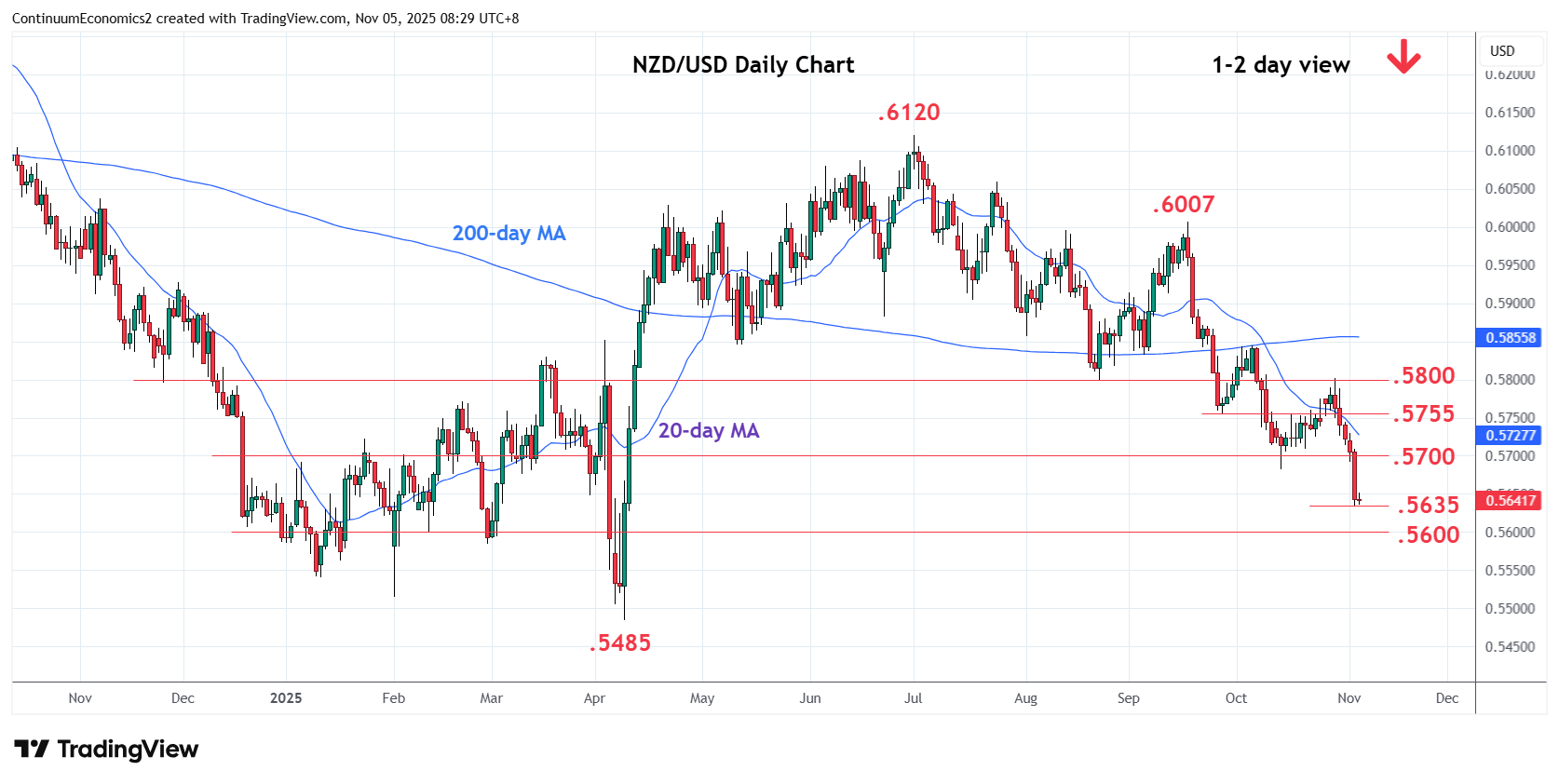 00:35 GMT - Break of the .5700 level and .5683 low of October has seen losses to reach .5635, 76.4% Fibonacci level. Pause here see prices consolidating steep drop from the .5800 high of last week as prices unwind oversold intraday studies. Bearish momentum keeps pressure on the downside and break further losses not ruled out. Lower will see room to target the .5600 level. However, oversold daily and weekly studies caution corrective bounce. Meanwhile, resistance is lowered to .5700 congestion. Regaining this needed to ease the downside pressure and see room for stronger bounce to retest .5755, September low.