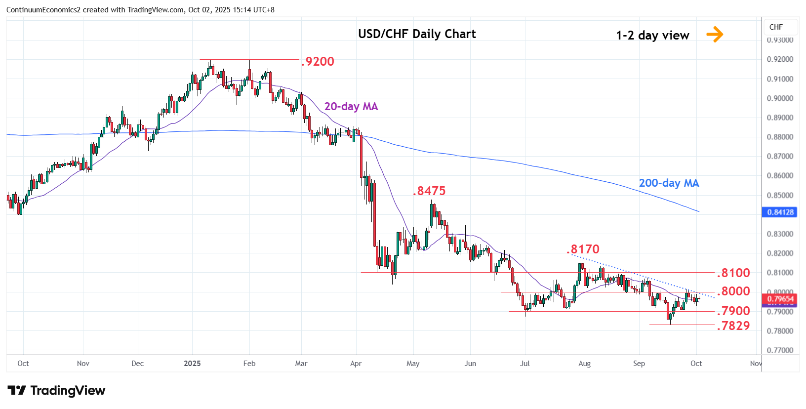 07:15 GMT - Leaning lower from test of the .8000 level as prices consolidate gains from the .7829, 17 September current year low. Pullback see support at the .7915/00 area which should underpin and limit corrective pullback. Would take break here to return focus to the .7829 low and further extend losses from the January high. Would take break of resistance at the .8000 figure to open up room for stronger correction of the August/September losses to the .8050/.8100 congestion area.