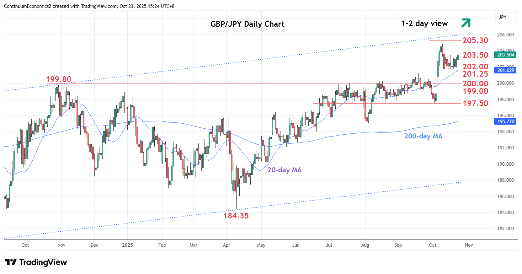 07:30 GMT - Extend bounce from the 201.25 support to retest resistance at the 203.50 congestion. Daily studies have turned positive and suggest scope for break here to open up the 205.30 current year high to retest. Would expect reaction here but a later clearance cannot be ruled out. Higher will see room for extension to the 206.00 congestion then July 2024 year high at 208.10. Meanwhile, support is raised to 202.00 level which should underpin. Break here will return focus to the downside for retest of 201.25 low and see the gap area at 200.20/198.85 attracting.