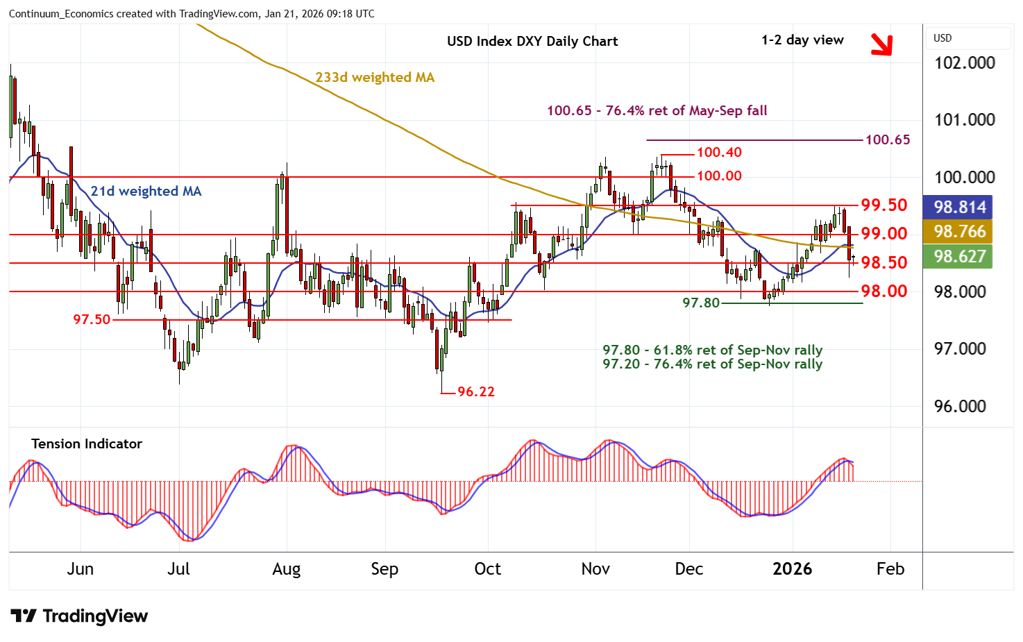 09:10 GMT - Little change, as the sharp bounce from the 98.25 low of 20 January gives way to extended consolidation around 98.65. Daily stochastics are falling and the daily Tension Indicator has turned bearish, highlighting room for fresh tests lower in the coming sessions. A break below congestion support at 98.50 will open up 98.25. But mixed weekly charts should limit any initial continuation beneath here in consolidation above strong support at congestion around 98.00 and the 97.80 Fibonacci retracement. Meanwhile, resistance remains at congestion around 99.00. A close above here, if seen, will help to stabilise price action and give way to consolidation beneath 99.50.