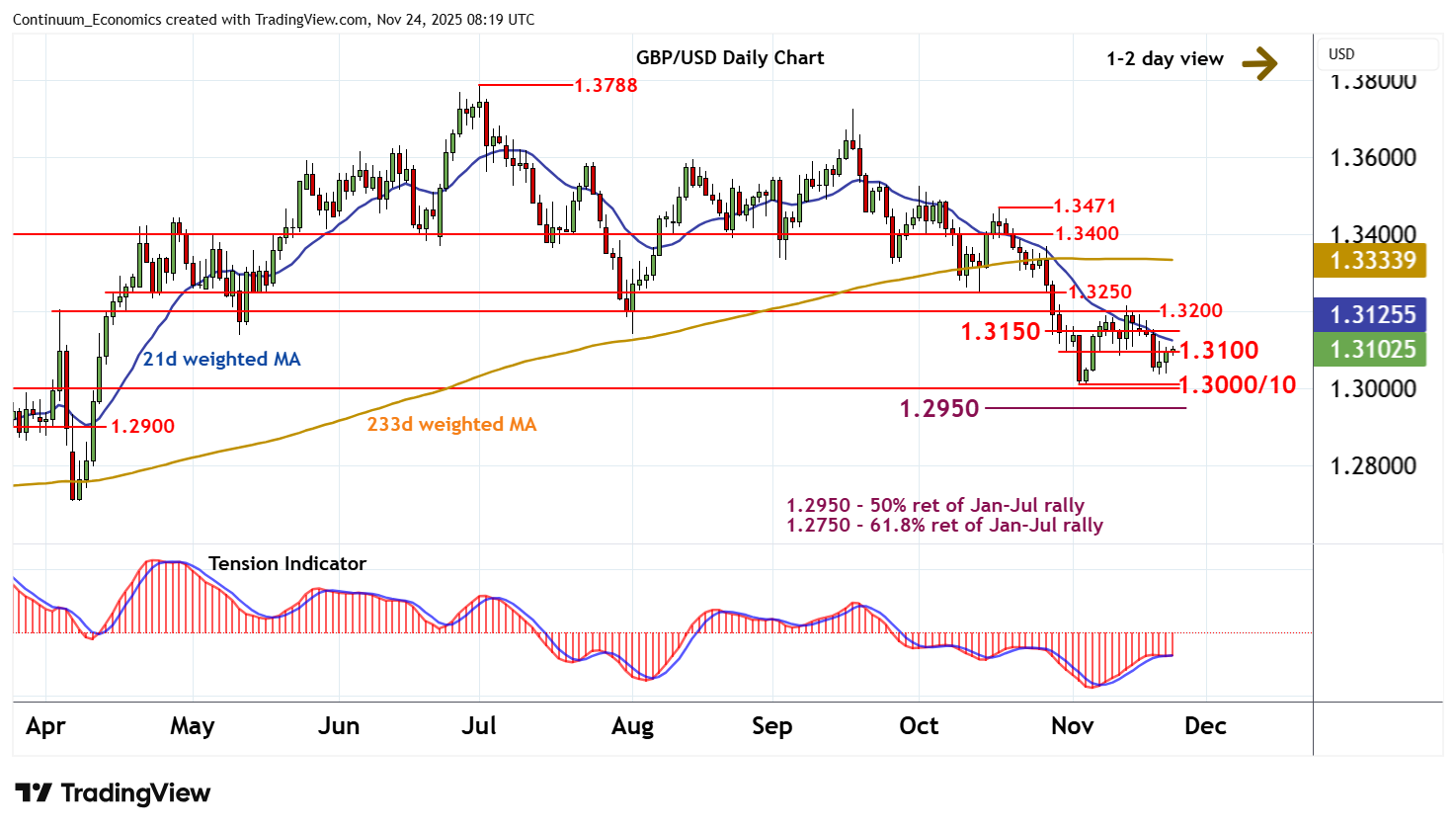 08:10 GMT - Little change, as prices extend pressure on resistance at the 1.3100 break level. Rising intraday studies and flattening bearish daily readings highlight room for a test above here towards resistance at congestion around 1.3150. But mixed/negative weekly charts should limit any further break in renewed selling interest/consolidation beneath congestion around 1.3200. Meanwhile, support remains at congestion around 1.3000 and the 1.3010 weekly lows from early November. A close beneath here will turn sentiment negative and extend July losses towards the 1.2950 Fibonacci retracement.