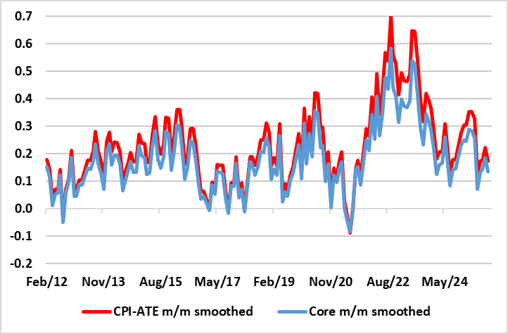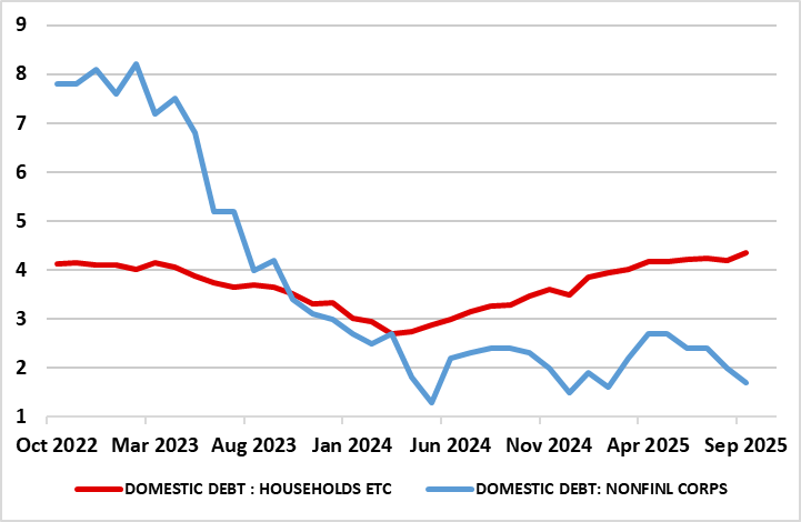 After what was to some a surprise move in September, in which the Norges Bank cut is policy rate by a further 25 bp to 4.0%, we see no change at Nov 6 verdict. After all, there will be no fresh forecasts, albeit with the Board likely to reinforce existing hints of a further 25 bp move at the Dec 18 decision. That December meeting will have both new forecasts and data for the Board to peruse, not least inflation and lending numbers, the latter possibly becoming a worry given the fresh slowing in corporate credit growth (Figure 1). But with inflation dynamics ever more friendly (Figure 2), we still think that the Norges Bank is being too cautious and that (on the basis of its own calculations), policy will be very restrictive through the projected timeframe out to 2028 and where we wonder why inflation only just approaches the 2% target by the end of that period.