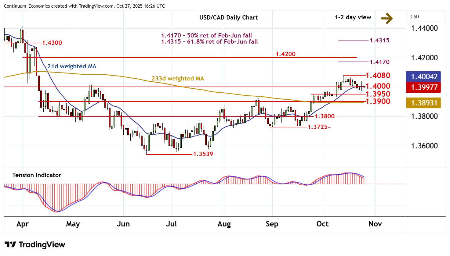 16:05 GMT - The break back below 1.4000 has not been sustained, with prices once again balanced in cautious trade around here. Intraday studies are mixed/positive and oversold daily stochastics are flattening, suggesting room for a test higher. But the negative daily Tension Indicator and mixed weekly charts should limit initial scope in consolidation beneath the 1.4080 weekly high of 14 October. A close above here, however, would turn sentiment positive and confirm continuation of June gains towards the 1.4170 Fibonacci retracement. Meanwhile, support is at 1.3950 and extends to 1.3900. This range should underpin any immediate setbacks.