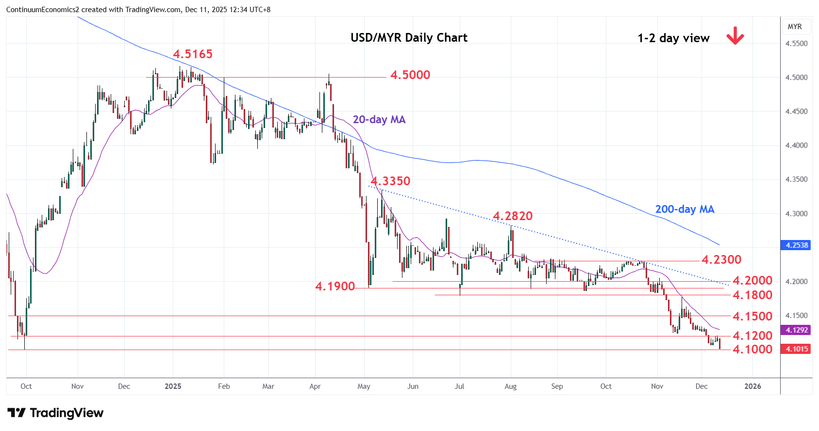 04:40 GMT - Consolidation below the 4.1200/40 resistance has given way to renewed selling pressure, break of the 4.1060 low turning focus to the 4.1000, September year low. Break here will further extend the broader losses from the 2024 year high and see room to support 4.0900/4.0800 congestion area and the 4.0780, 76.4% Fibonacci level. Lower still, will see extension to 4.0500 congestion. Meanwhile, resistance is lowered to the 4.1240 November low which is expected to cap and sustain losses from the January year high.