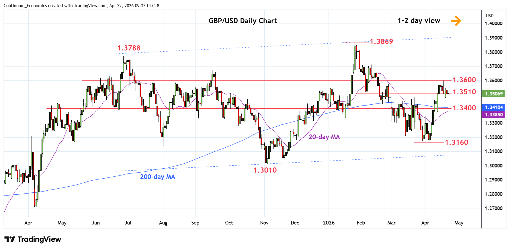 01:35 GMT - Back in consolidation at the 1.3500 level following bounce from support at 1.3480, March high. A deeper corrective pullback from the 1.3600 level cannot be ruled out to retrace gains from the 1.3160 March low to support at the 1.3400 congestion. However, corrective pullback are expected to give way to renewed buying interest later. A later break above the 1.3600 level will further retrace the January/March losses and see room to 1.3650/1.3700 area. Beyond this will return focus to 1.3788 and 1.3869, 2025 year high and January YTD high.