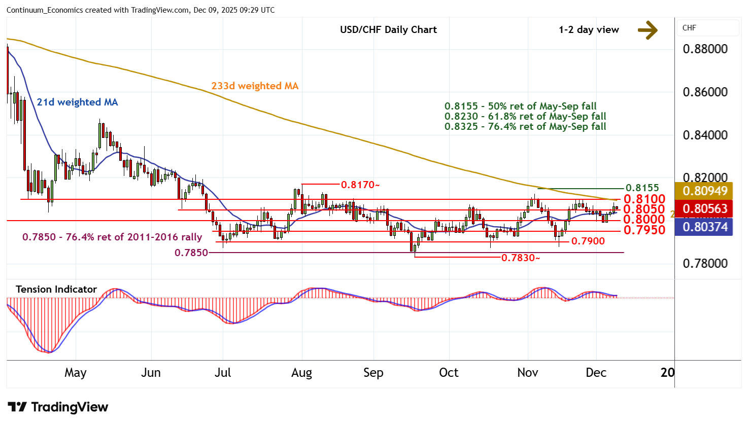 09:20 GMT - The break above 0.8050 has met selling interest around 0.8085, with prices currently balanced in cautious trade above 0.8050. Intraday studies are under pressure, highlighting room for a test beneath here. But rising daily readings are expected to limit any immediate losses in fresh consolidation above congestion around 0.8000. Meanwhile, resistance is at the 0.8100 break level, and should cap any immediate tests higher. A close above here, however, will improve sentiment and open up critical resistance within the 0.8155/70~ range, where mixed weekly charts should prompt profit-taking/consolidation.