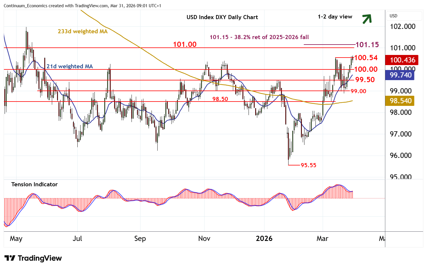 | R1 | 100.54 | ** | 13 Mar (m) high | S4 | 98.65 | * | 38.2% ret of Jan-Mar rally |