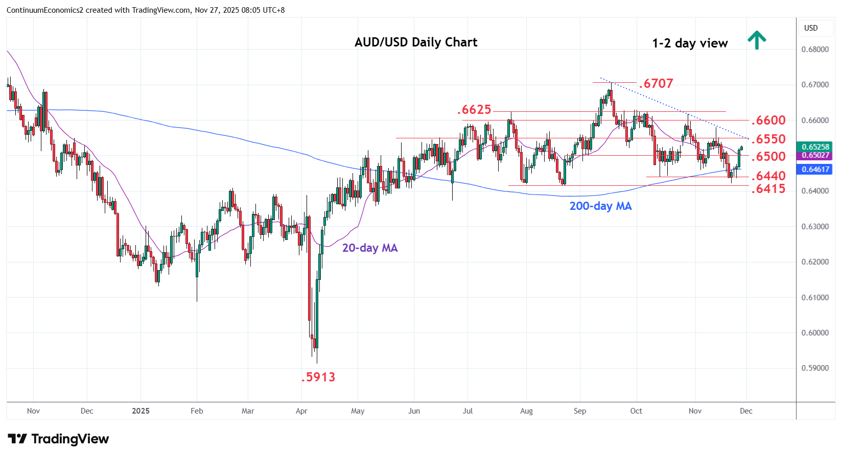 00:10 GMT - Break of the .6500/20 resistance see prices extending bounce from the .6440/15 support area. Daily and weekly studies have turned up from oversold areas and suggest room to extend gains to target resistance and trendline from the September high at .6550. Clearance here will see room for extension to strong resistance at the .6600 level and .6625/30 highs. Meanwhile, support is raised to the .6500 level which should underpin and sustain bounce from the strong support at the .6440/.6415, October/August lows.