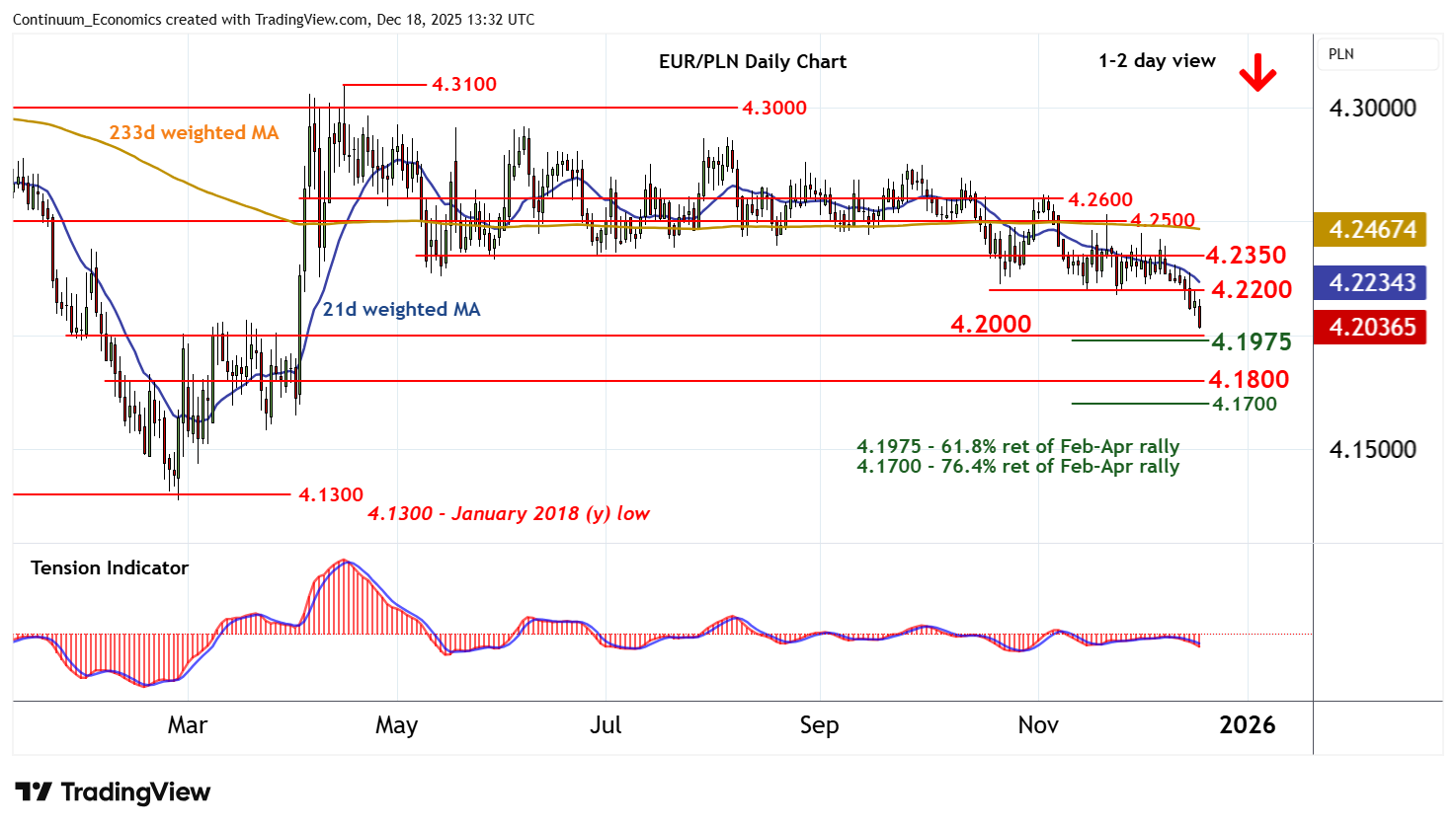 13:20 GMT - Cautious trade has given way to the anticipated break lower, with April losses approaching strong support at the 4.1975 Fibonacci retracement and congestion around 4.2000. Flattening oversold daily stochastics could limit any initial tests in consolidation, before the negative daily Tension Indicator and bearish weekly charts prompt further losses. A close beneath here will add weight to already bearish price action and open up a test of congestion support at 4.1800. Meanwhile, resistance is lowered to congestion around 4.2200. An unexpected close above here will help to stabilise price action and give way to consolidation beneath further congestion around 4.2350.