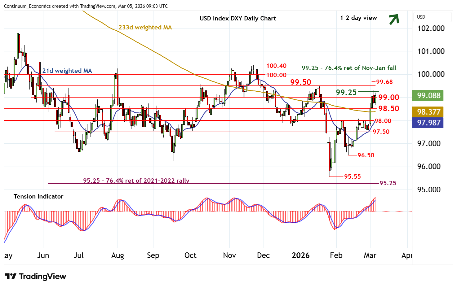| R3 | 99.68 | 3 Mar YTD high | S2 | 98.50 | * | congestion | ||