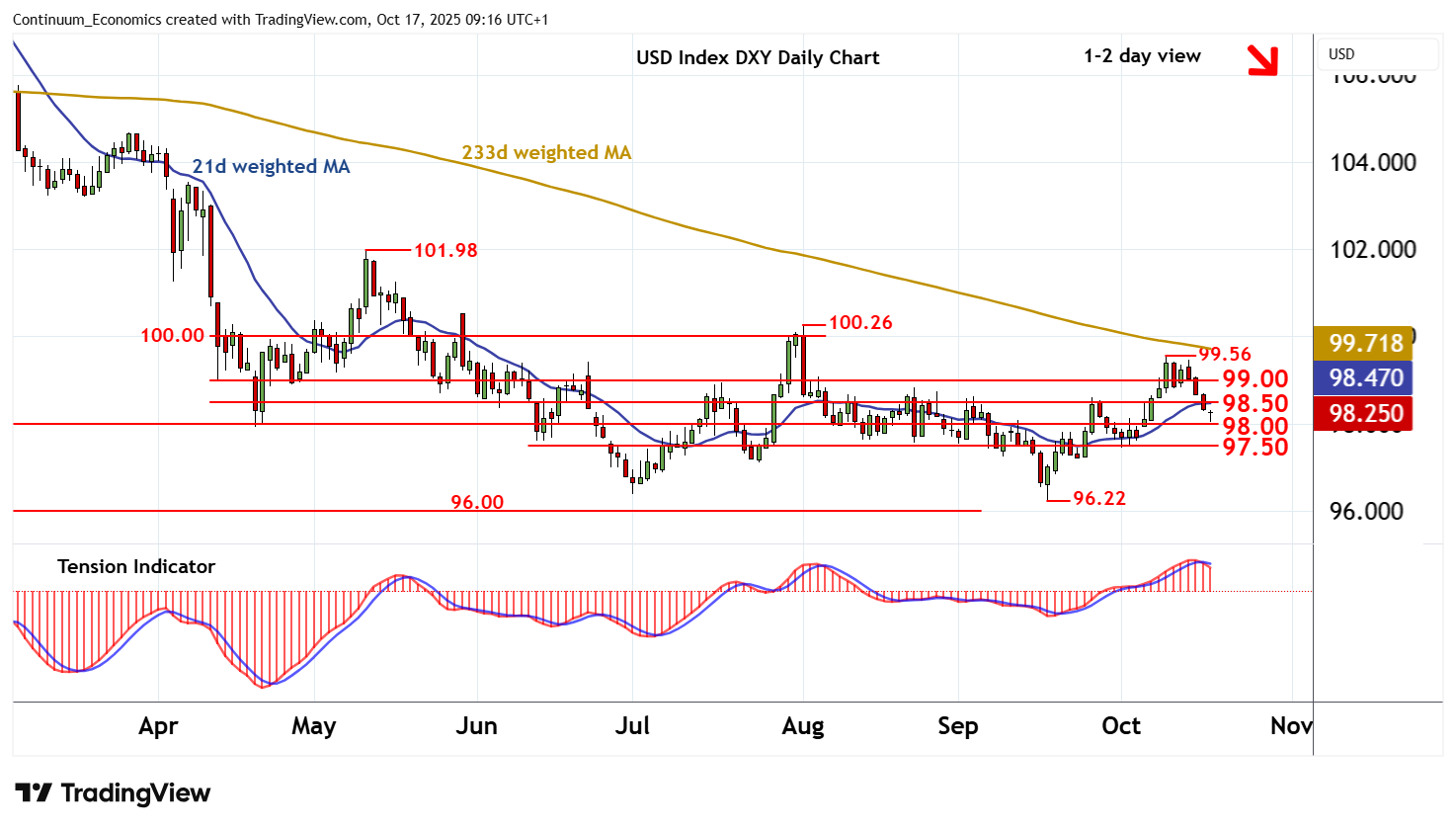 09:05 BST - Steady losses are meeting support just above congestion around 98.00, as oversold intraday studies flatten, with prices currently trading around 98.20. Daily readings continue to track lower, highlighting room for a later break beneath here towards further congestion around 97.50. But mixed weekly charts should limit any initial tests in renewed consolidation. Meanwhile, resistance is lowered to 98.50. A close above here, if seen, will help to stabilise price action and prompt consolidation beneath 99.00.
