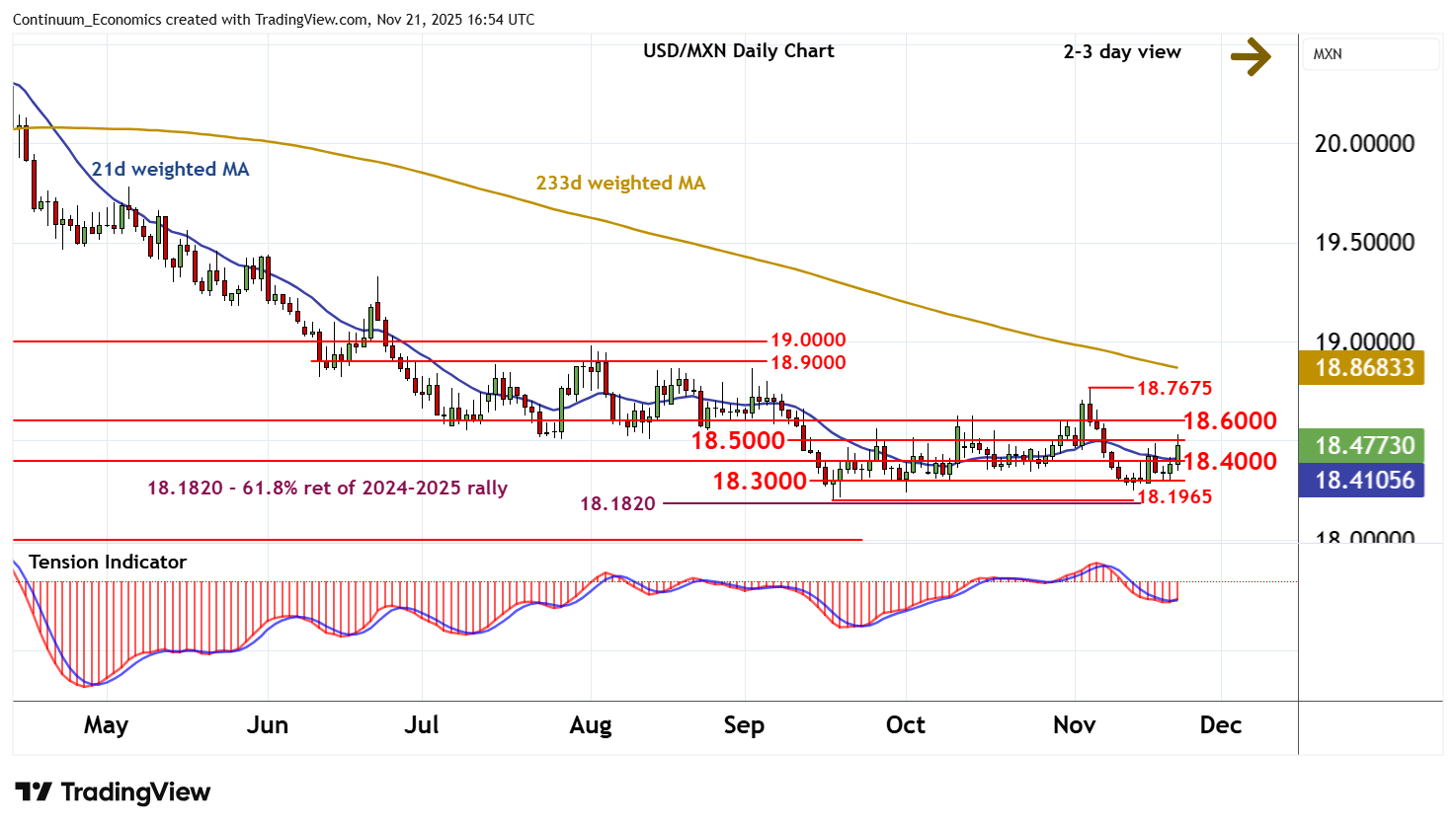 16:40 GMT - Cautious trade around congestion support at 18.3000 has given way to a bounce, as daily studies improve, with the break above 18.4000 turning sentiment neutral and reaching further congestion around 18.5000. A further break will open up 18.6000. But mixed weekly charts are expected to limit any initial tests in renewed consolidation. A break, however, will improve sentiment and prompt a test of stronger resistance at the 18.7675 weekly high of 5 November. Meanwhile, support is at congestion around 18.4000 and extends to 18.3000. This range should underpin any immediate setbacks.