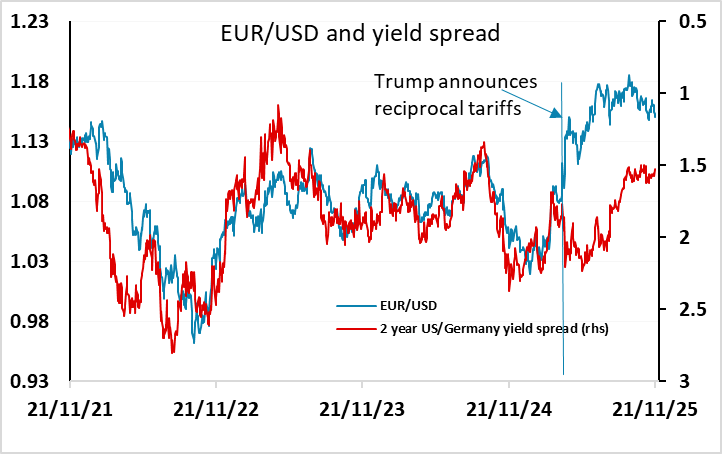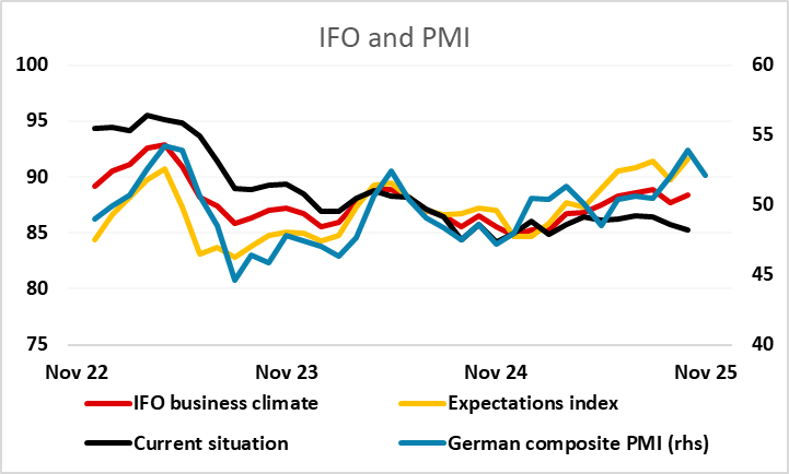 A fairly quiet overnight session with Japan closed for Labor day, but there is a mild risk positive tone as equities gapped higher at the Asian open, helped by hopes of a Ukraine peace deal and some increased expectations of a Fed cut in December. The JPY and CHF weakened in Asia, and the EUR is slightly firmer, but there hasn’t been much action in the commodity currencies. The German IFO survey this morning will gain some attention, but seems unlikely to have a big impact. The IFO has moved fairly closely with the PMI in recent months, albeit slightly underperforming but the dip in the PMI in November from higher levels suggests something fairly flat in the IFO. But the EUR may gain some support from optimism about a Ukraine peace deal, even though this still seems to be some way away from completion.