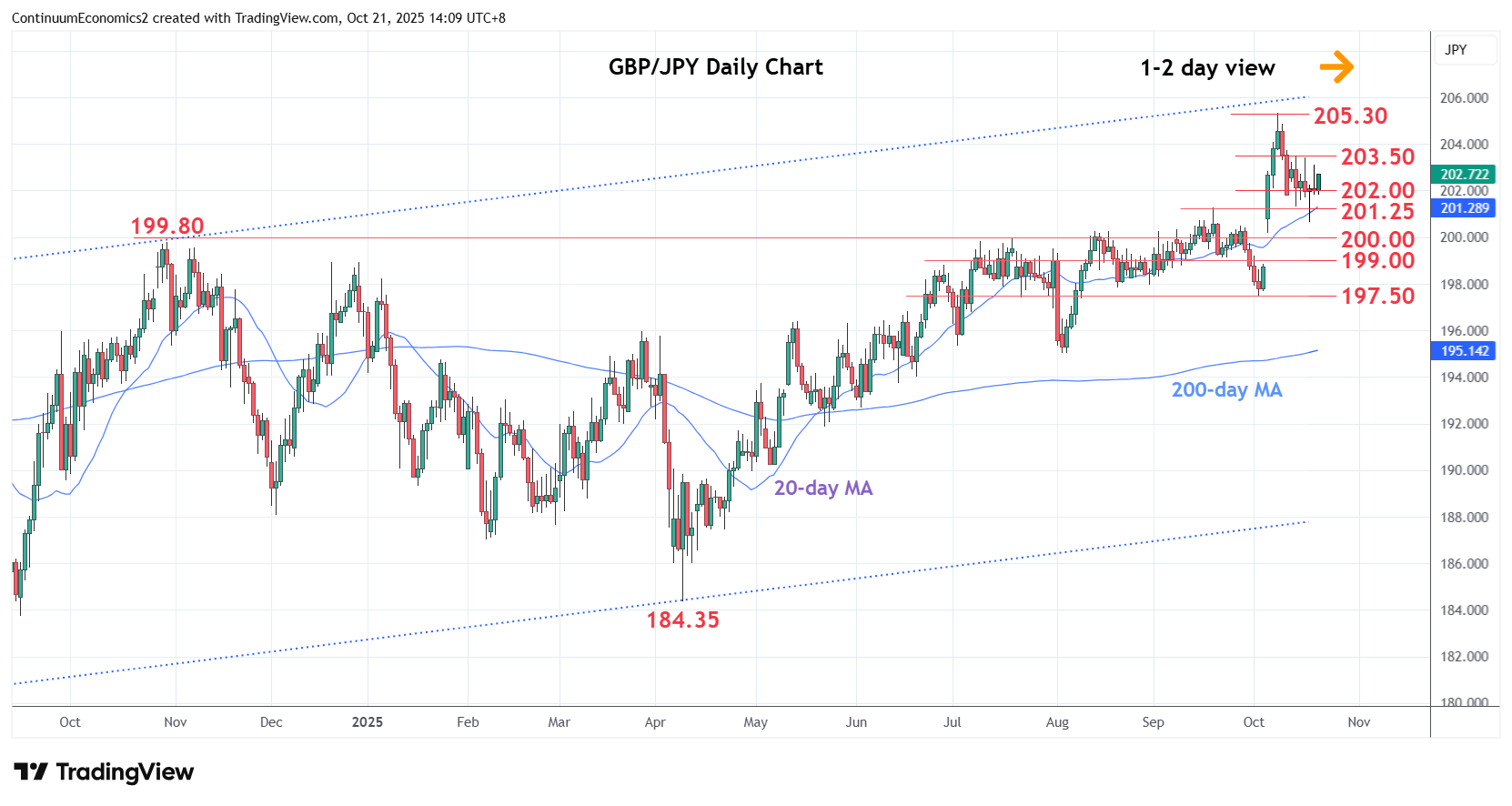 06:40 GMT - Limited on break of the 201.25 support and bounce to regain the 202.00 level sets up room for retest of resistance at the 203.50 congestion. Daily studies have turned positive and suggest scope for break here to open up the 205.30 current year high to retest. Beyond this will see room for extension to the 206.00 congestion then July 2024 year high ar 208.10. Meanwhile, support is raised to 202.00 level which should underpin. Break here will expose the 201.25 low to retest and see the gap area at 200.20/198.85 attracting.