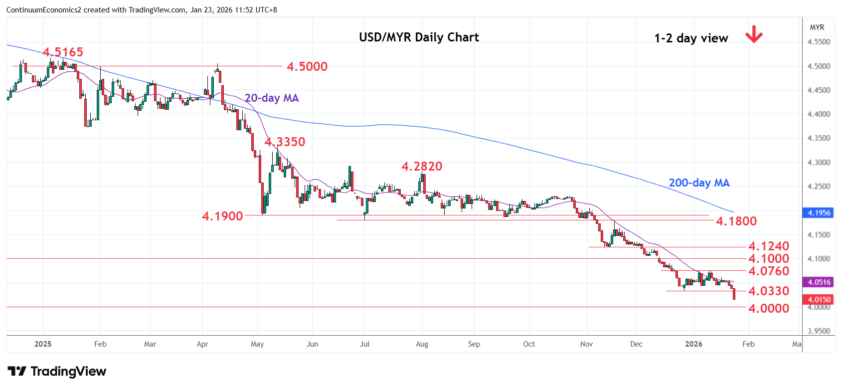 04:10 GMT - Break of the 4.0330 December 2025 year low see prices extending losses from the 2024 year high. Negative daily and weekly studies keeps pressure on the downside and see room for retest of the 4.0000 figure and the January 2021 year low. Would expect reaction at the latter but a later break will open up room for further losses to 3.9700, June 2018 low. Meanwhile, resistance is lowered to the low of last year at 4.0330 which is expected to cap. Above here will see room for stronger corrective bounce to the 4.0600/4.0760 resistance.