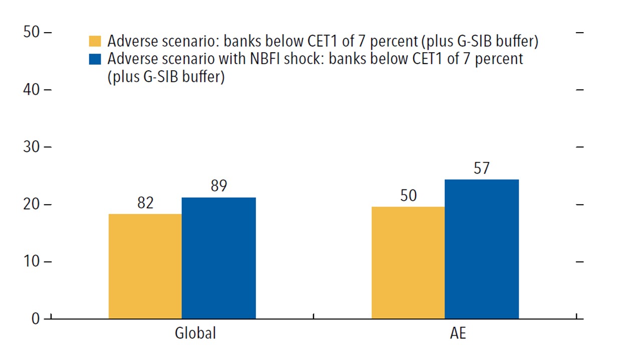 What about other areas including non-banks? BIS research shows that non-banks reduce lending quicker than banks in a crisis (here), as they are more transaction focused and pro cyclical in their behavior. The October 2025 IMF GSFR p23 also highlighted that the growing interlinkage between banks and NFBI’s (including mortgage companies/investment funds/private equity and credit /hedge funds) in the U.S. and Europe could result in a larger deterioration in banks capital ratio in an adverse scenario. The IMF GSFR highlights some large banks in the Eurozone, but mid-sized banks in the U.S. would take a capital hit, that would require some recapitalization (Figure 3) – the results though are better than the 2023 IMF stress tests. However, the IMF shock in this scenario is a large stagflationary shock, which produces a jump in government bond yields and larger rise in corporate bond and loan rates. This is a low to modest probability event, given that Trump tariffs are disinflationary outside the U.S., a 17% effective tariff rate have not materially boosted U.S. inflation trends and we are passed peak Trump tariff threats.