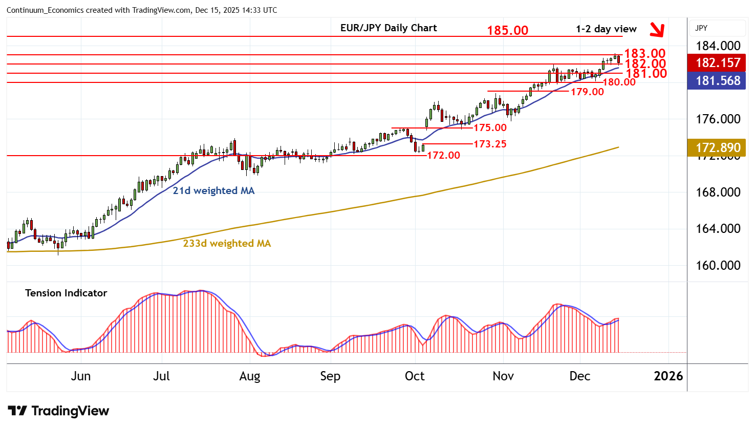 14:25 GMT - Cautious trade beneath critical resistance at 183.00~ has given way to a pullback to support at 182.00, where flat oversold intraday studies are prompting short-term reactions. Overbought daily stochastics are unwinding and the positive daily Tension Indicator is flattening, suggesting room for further losses in the coming sessions. A break will open up congestion around 181.00. But a close below 180.00 is needed to turn sentiment negative and confirm a near-term top in place around 183.00, as renewed selling interest then targets 179.00. Meanwhile, a close above 183.00, if seen, will improve sentiment and extend long-term gains towards 185.00.