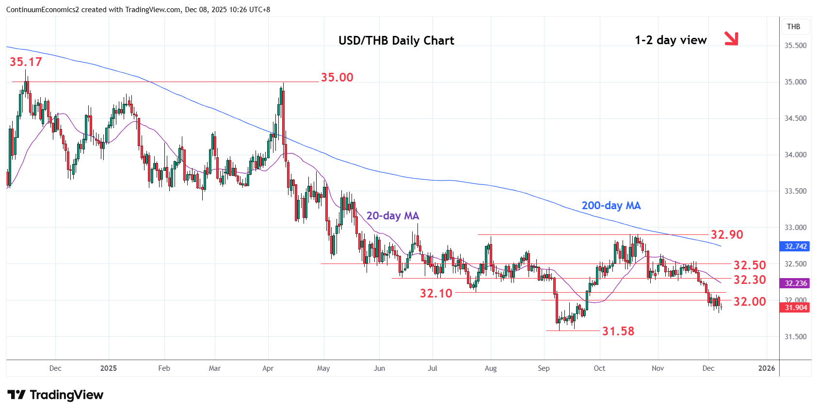 02:35 GMT - Still heavy as prices extend break of the 32.00 level and see scope to the 31.76 support. Below this will see room for extension to retest the 31.58, September current year low. Break here will extend the broader losses from the 2022 year high and see room to support at 31.30 and the 31.00 figure. Meanwhile, resistance at the 32.00/32.10 congestion and July low expected to cap. Regaining these will see room for stronger bounce to retrace losses from the October high to strong resistance at the 32.30 congestion.