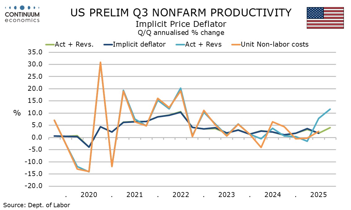 Strong Q3 GDP combined with subdued aggregate hours worked as payroll data had already implied is behind a strong 4.9% rise in Q3 non-farm productivity, which is in line with expectations, and with moderate wage growth has seen unit labor costs fall by 1.9%, softer than expected, though non-labor costs at the same time are surging, presumably lifted by tariffs.