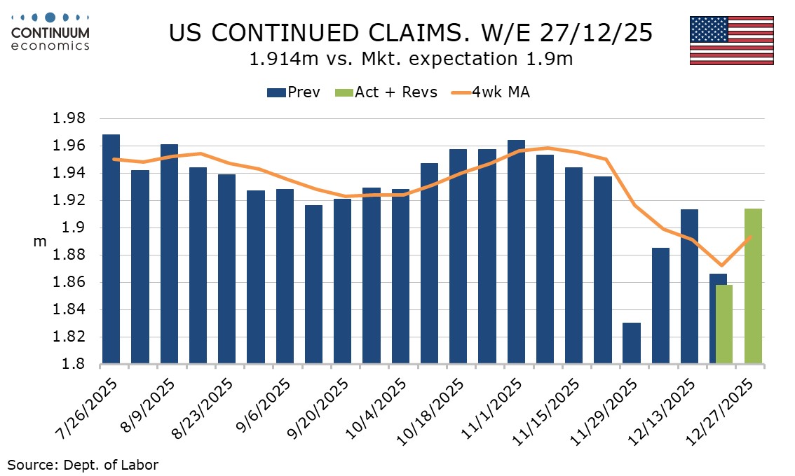 Continued claims at 1.914m are higher than expected, exactly reversing a dip to 1.858m in the preceding week. Continued claims cover the week before initial claims, so the latest continued claims data is for Christmas week.