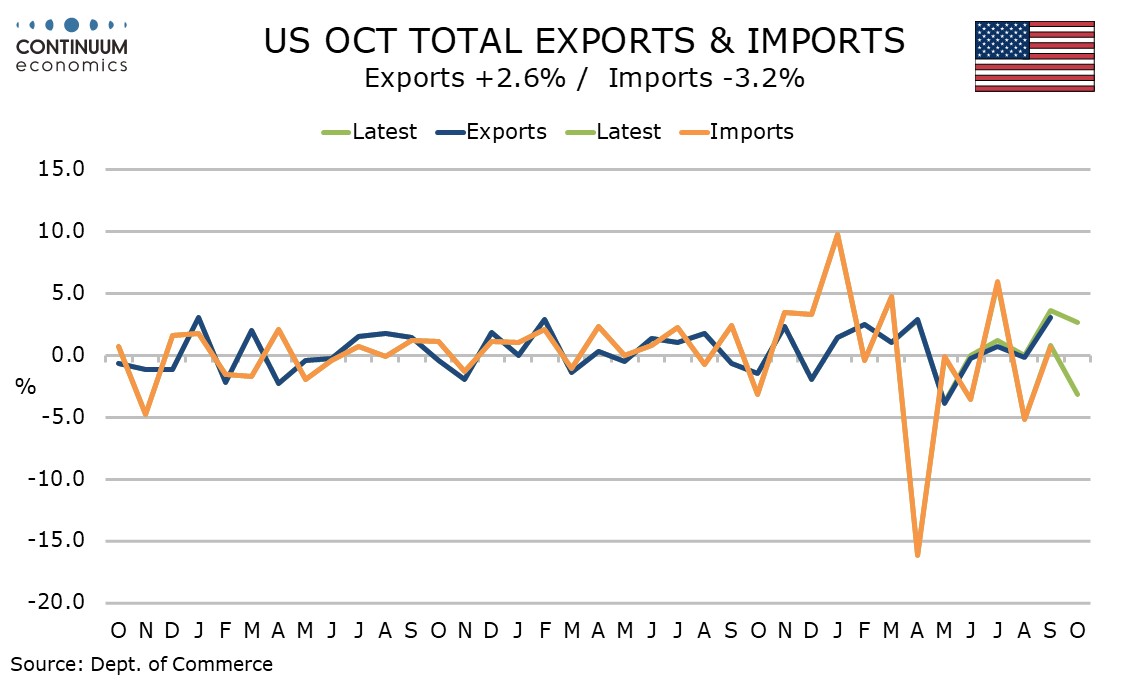 The big shock in the latest data is a dramatic fall in October’s trade deficit to $29.4bn from $48.1bn, to its lowest level since February 2009. This will lift Q4 GDP estimates and give Trump a political boost as the Supreme Court prepares to make a judgement on his tariffs. However the strength, led by surging nonmonetary gold exports and plunging imports of pharmaceutical preparations does not look sustainable.