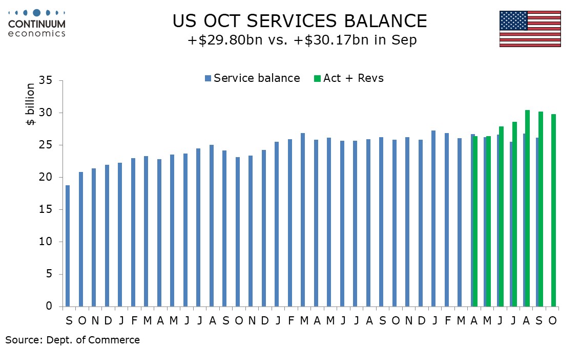 Service exports rose by 0.7%. Service imports rose by 1.4% bringing a dip in the services surplus but recent revisions to surplus trade assisted the positive surprise in the data.