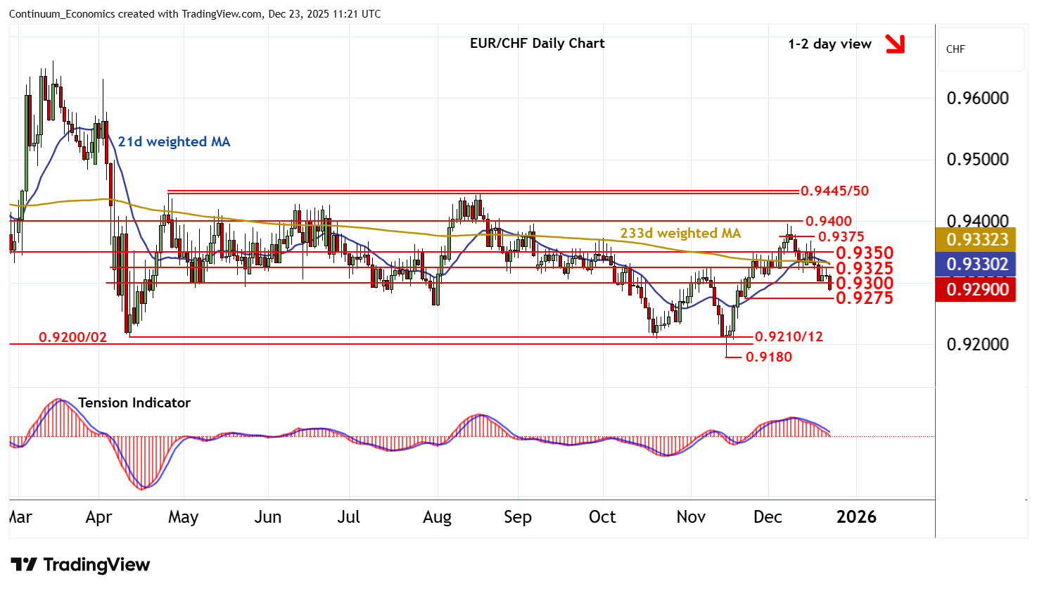 10:50 GMT - Cautious trade is giving way to selling interest, with prices currently trading just below congestion support at 0.9300. Daily readings are under pressure and broader weekly charts are turning down, highlighting room for further losses in the coming sessions. Focus is on the 0.9275 low of 21 November. But already oversold intraday studies are expected to limit any initial tests in consolidation, before fresh selling interest prompts deeper losses towards the 0.9210/12 lows from April-October. Meanwhile, resistance is at congestion around 0.9325. A close above here, if seen, will help to stabilise price action and prompt consolidation beneath further congestion around 0.9350.