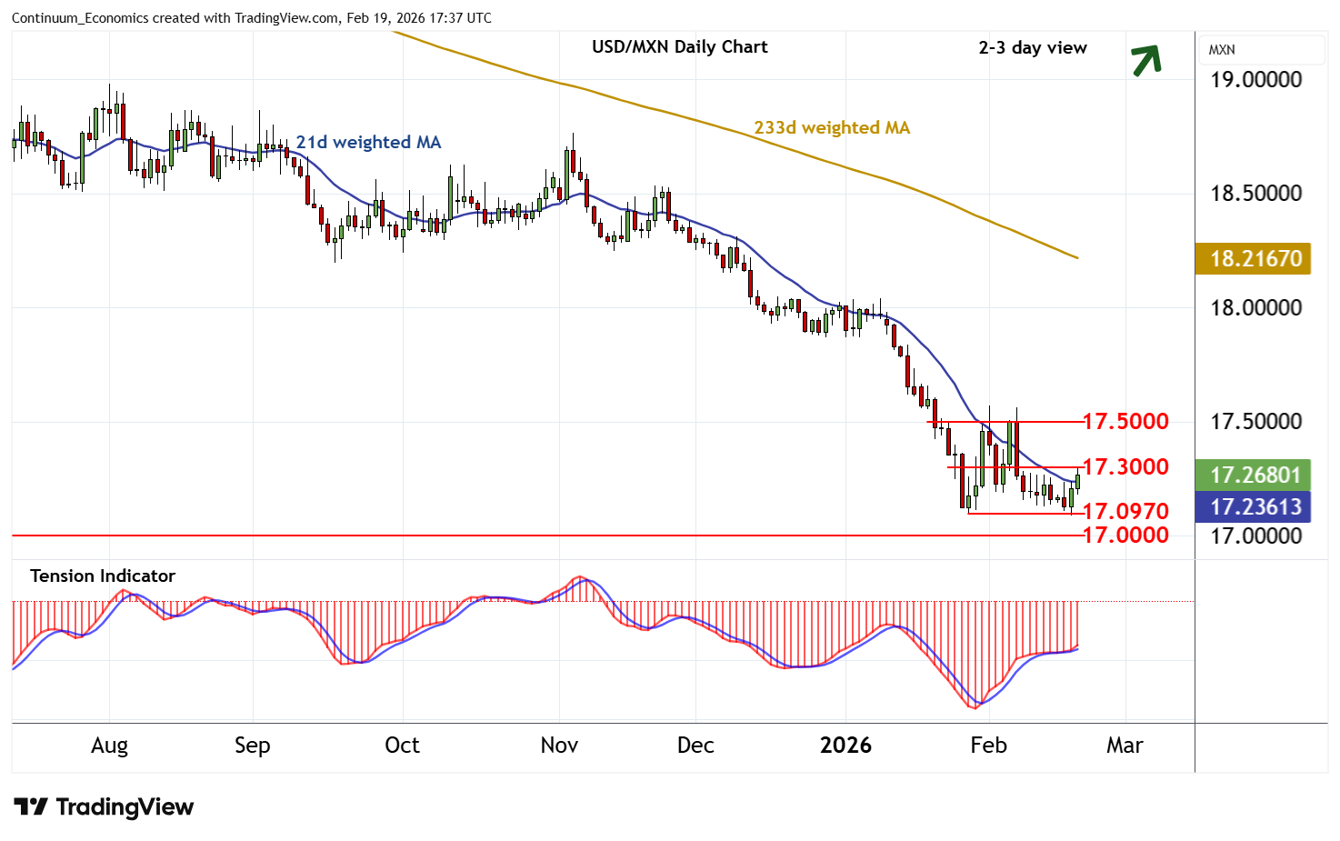 17:05 GMT - A cautious tone, as prices extend consolidation within the 17.0970 - 17.3000 range. The daily Tension Indicator is rising and flat daily stochastics are also ticking up, highlighting room for a test above 17.3000. But mixed/negative weekly charts are expected to limit scope in renewed selling interest beneath strong resistance within congestion around 17.5000 and the 17.5700 weekly high of 2 February. Meanwhile, support is at the 17.0970 monthly low of 28 January. A close beneath here would add weight to sentiment and extend February 2025 losses initially to congestion around 17.0000.