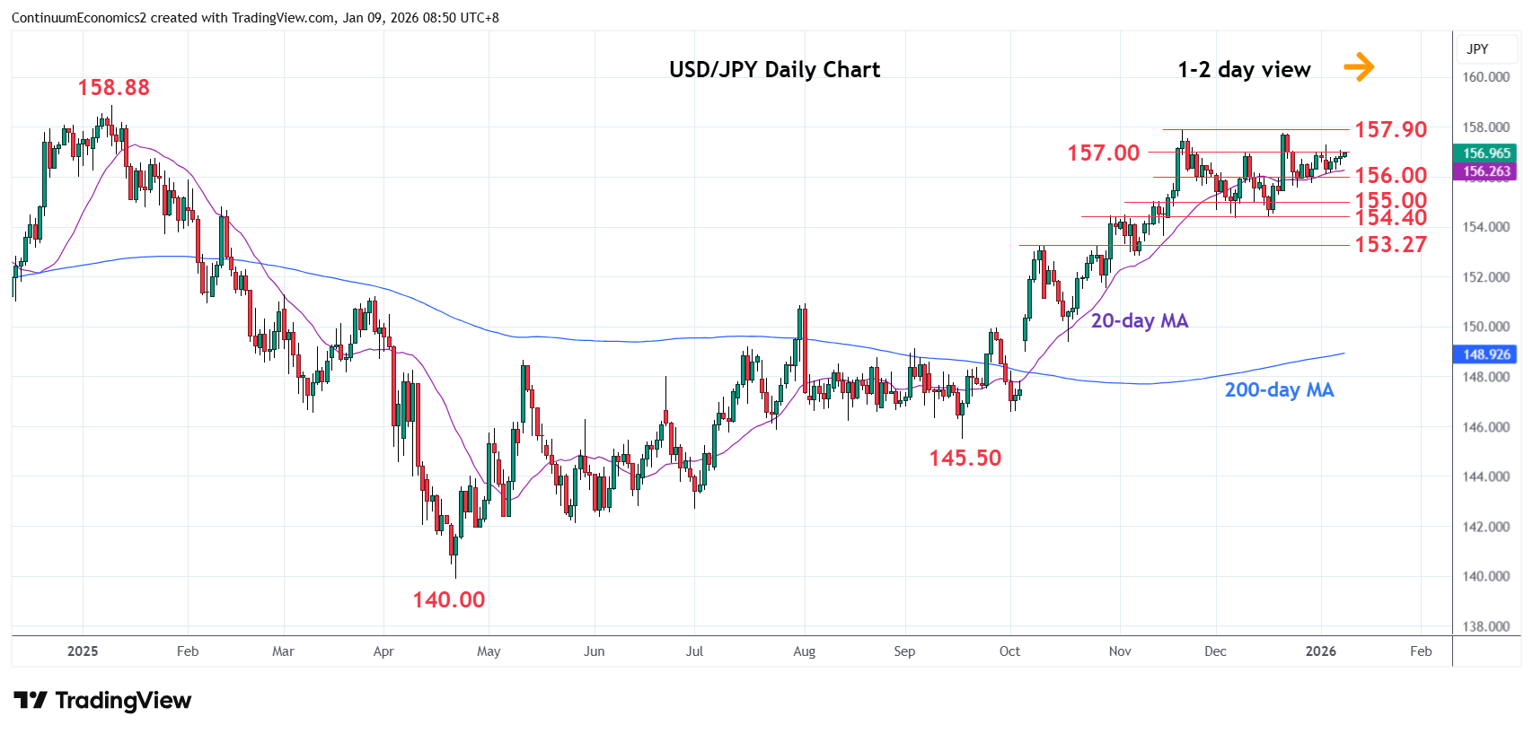00:50 GMT - Edging higher in consolidation within the Monday's range to pressure resistance at the 157.00/30 area. Break here cannot be ruled out but gains are expected to give way to selling pressure on retest of the 157.78/157.90, December/November highs. Clearance, but not expected, will extend the April gains and turn focus to the 158.88, January 2025 year high. Meanwhile, support at the 156.00 congestion now underpin. Would take break here to fade the upside pressure and open up room for pullback to retest of support at 155.00 congestion then the 154.40/35, December lows.