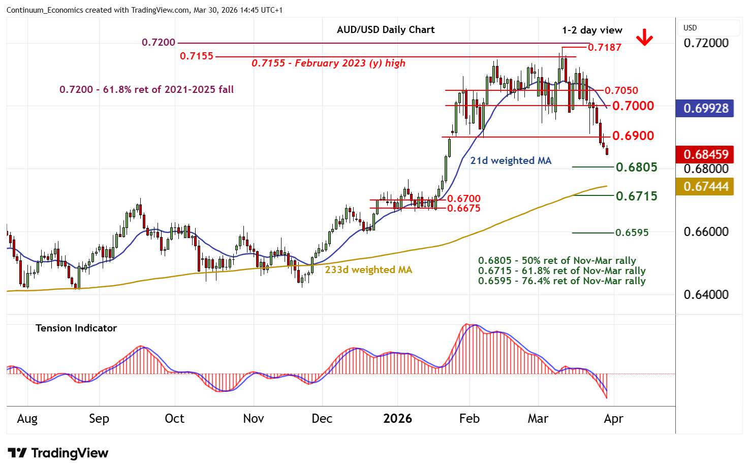 14:30 BST - Cautious trade around 0.6870 is giving way to fresh selling interest, with prices currently trading around 0.6845. Daily readings continue to point lower and broader weekly charts are falling, highlighting room for continuation of March losses towards support at the 0.6805 Fibonacci retracement. Flattening oversold daily stochastics could limit any initial tests in consolidation, before prices continue lower. Meanwhile, resistance remains at 0.6900. A close back above here, if seen, will help to stabilise sentiment and prompt consolidation beneath congestion around 0.7000.