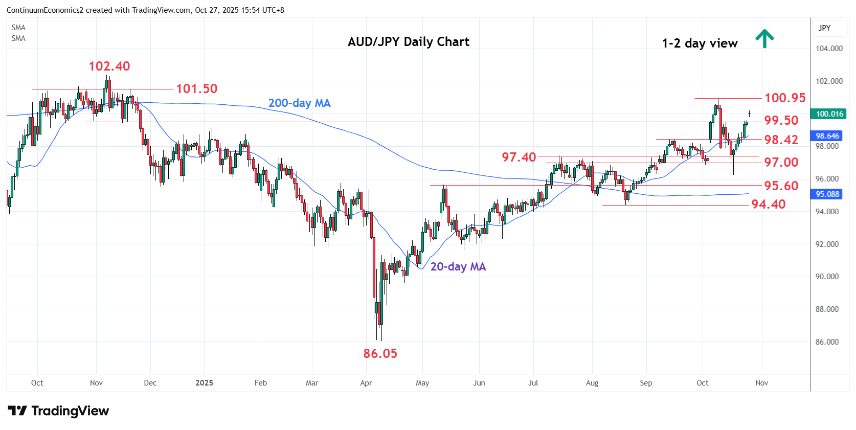 08:00 GMT - Gapped up opening above the 99.50 resistance see prices back to retest the 100.00 level. Positive daily studies keep pressure on the upside and suggest scope to retest the 100.95, 9 October current year high, where reaction can be expected. Clearance, if seen, will turn focus to the 102.40 high of November 2024. Meanwhile, support is raised to the 99.50 congestion. Below this will see room for deeper pullback to the strong support at the 98.42/97.40, September and July highs.