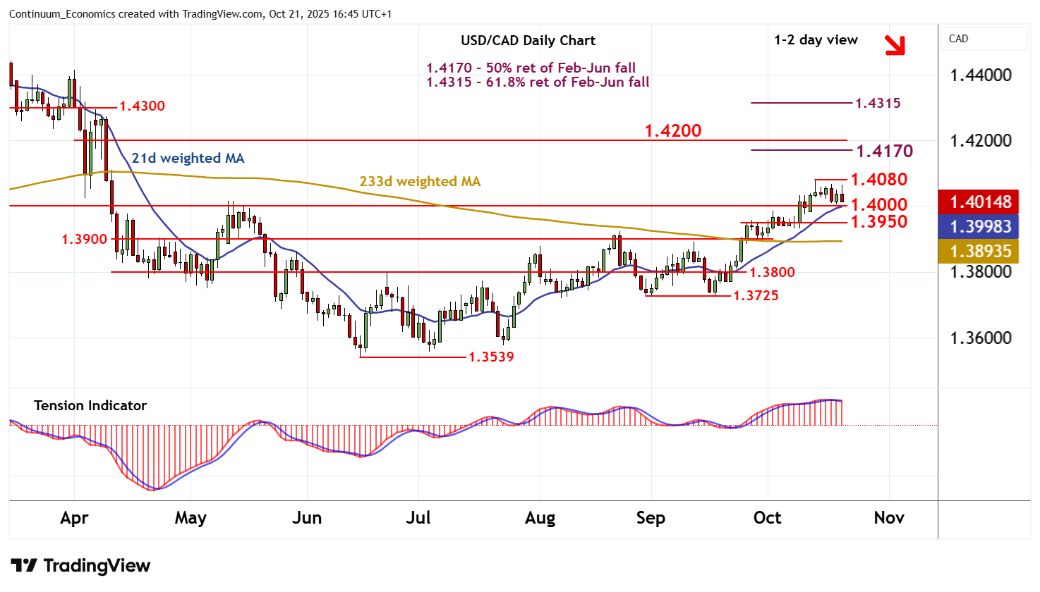 16:10 BST - Still little change, as prices extend consolidation within the 1.4000 - 1.4080 range. Daily stochastics and the daily Tension Indicator are under pressure, highlighting room for a drift lower, with support at 1.4000 to attract. Overbought weekly stochastics are also flattening, suggesting room for a break beneath here towards 1.3950. But the rising weekly Tension Indicator should limit any initial tests in fresh consolidation. Following cautious trade, higher levels are looked for. However, a close above the 1.4080 weekly high of 14 October is needed to turn sentiment positive and extend June gains towards the 1.4170 Fibonacci retracement.