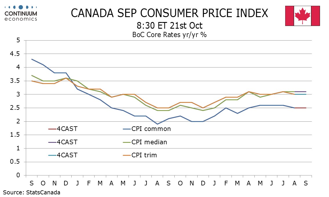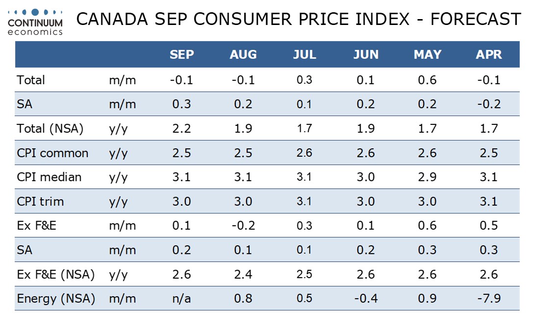 We expect September Canadian CPI to pick up to 2.2% yr/yr from 1.9%, in part on year ago weakness dropping out. The Bank of Canada’s core rates are likely to remain stable, and above the 2.0% target. The yr/yr headline rate will remain restrained by around 0.7% due to April’s abolition of the carbon tax.