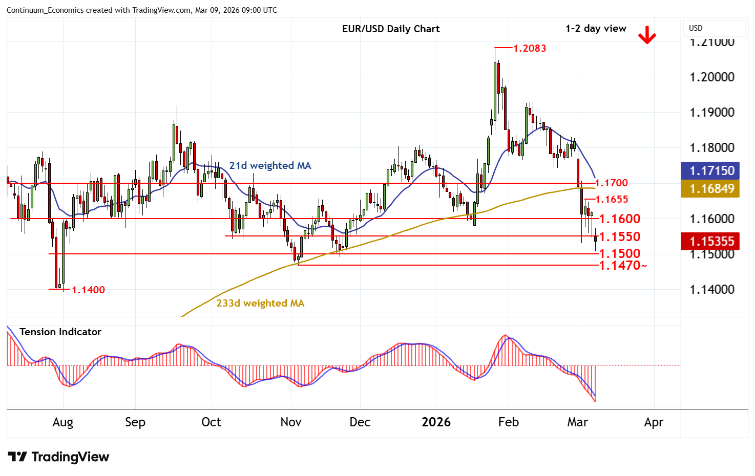 08:40 GMT - Cautious trade around congestion resistance at 1.1600 has given way to a sharp gap lower to post fresh 2026 year lows just above congestion support at 1.1500. Both intraday and daily studies are under pressure, highlighting room for still further losses in the coming sessions. A break will target the 1.1470~ monthly low of 5 November. Continuation beneath here will complete a multi-month distribution top beneath the 1.2083 current year high of 27 January, with focus to then turn to minor congestion around 1.1400. Still lower is the 1.1350~ Fibonacci retracement. Meanwhile, resistance is at congestion around 1.1550. A close above here, if seen, would help to stabilise price action and prompt consolidation beneath 1.1600.