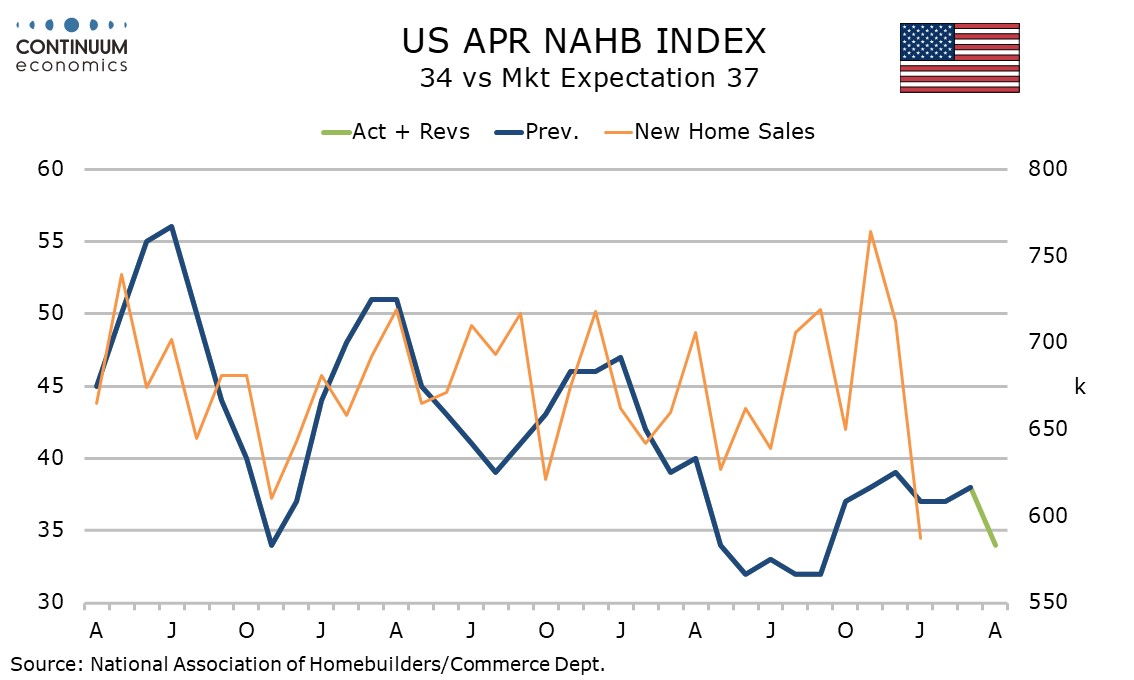 April’s NAHB homebuilders’ index of 34 is down from 38 in March and the lowest since September. It appears that higher mortgage rates as the oil shock reduced expectations for Fed easing are having an impact.