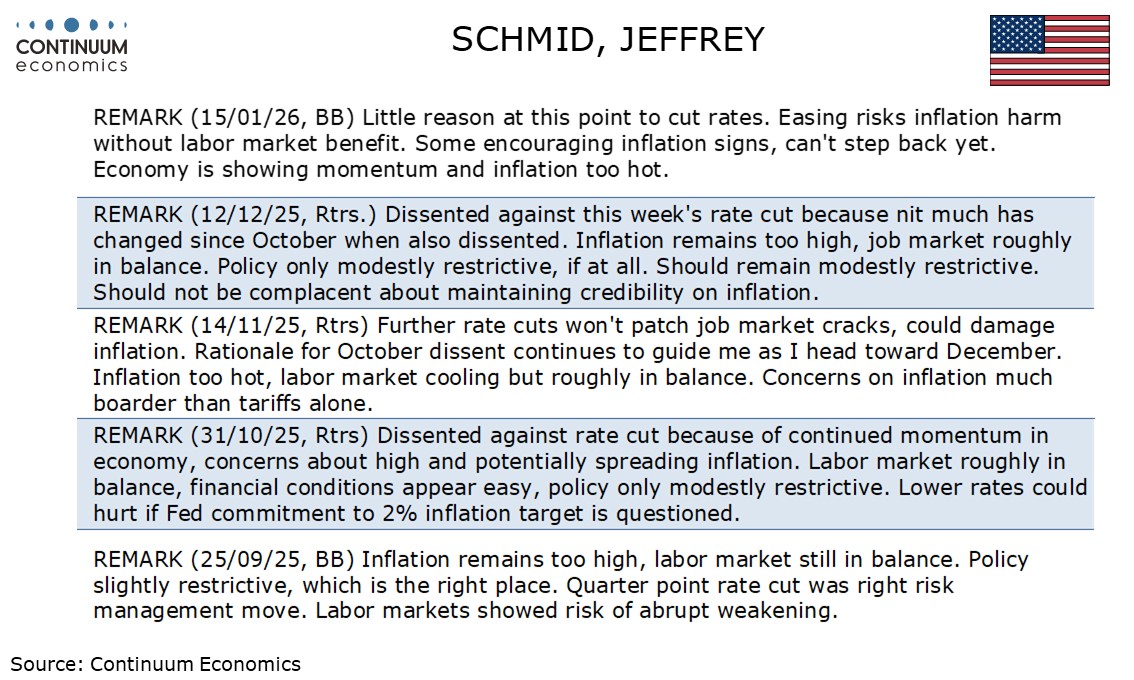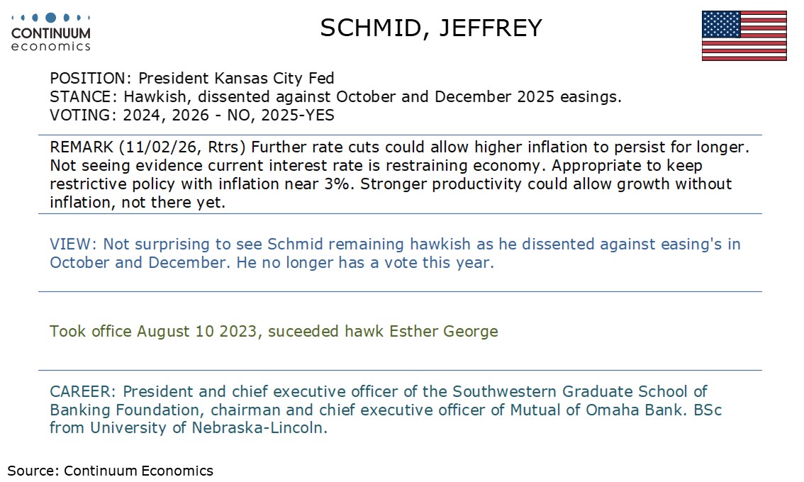 Fed's Schmid, who dissented against October and December easings, remains hawkish, but will not vote this year.
