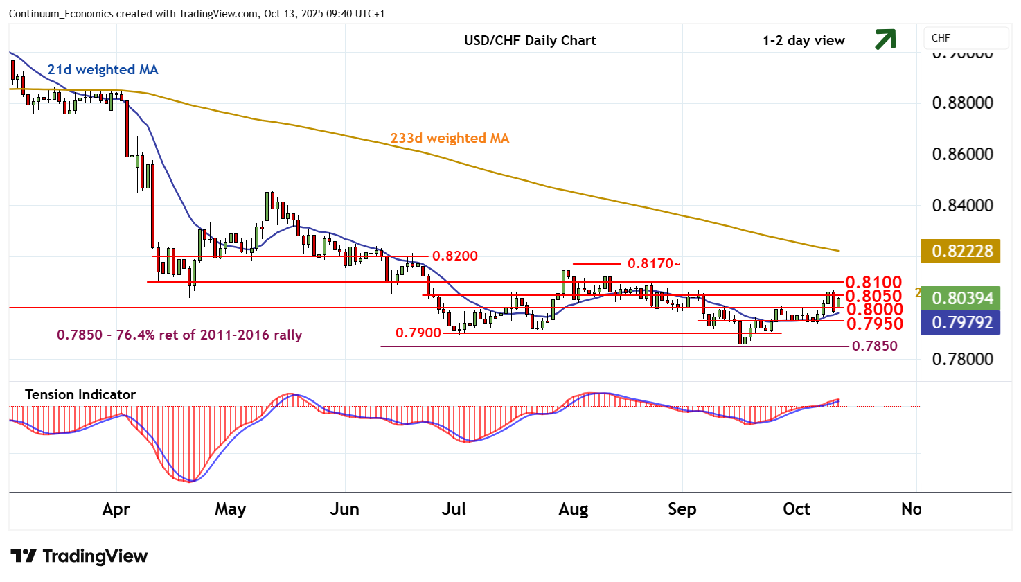 09:30 BST - The anticipated pullback has reached congestion support at 0.8000, where unwinding oversold intraday studies are prompting a bounce. Focus is turning back to resistance at 0.8050. But unwinding overbought daily stochastics are expected to limit any initial tests in consolidation, before the positive daily Tension Indicator and rising weekly charts prompt a break. Focus will then turn to congestion around 0.8100, via the 0.8075 weekly high of 9 October. Meanwhile, any tests below 0.8000 should meet renewed buying interest above the 0.7950 recent lows.