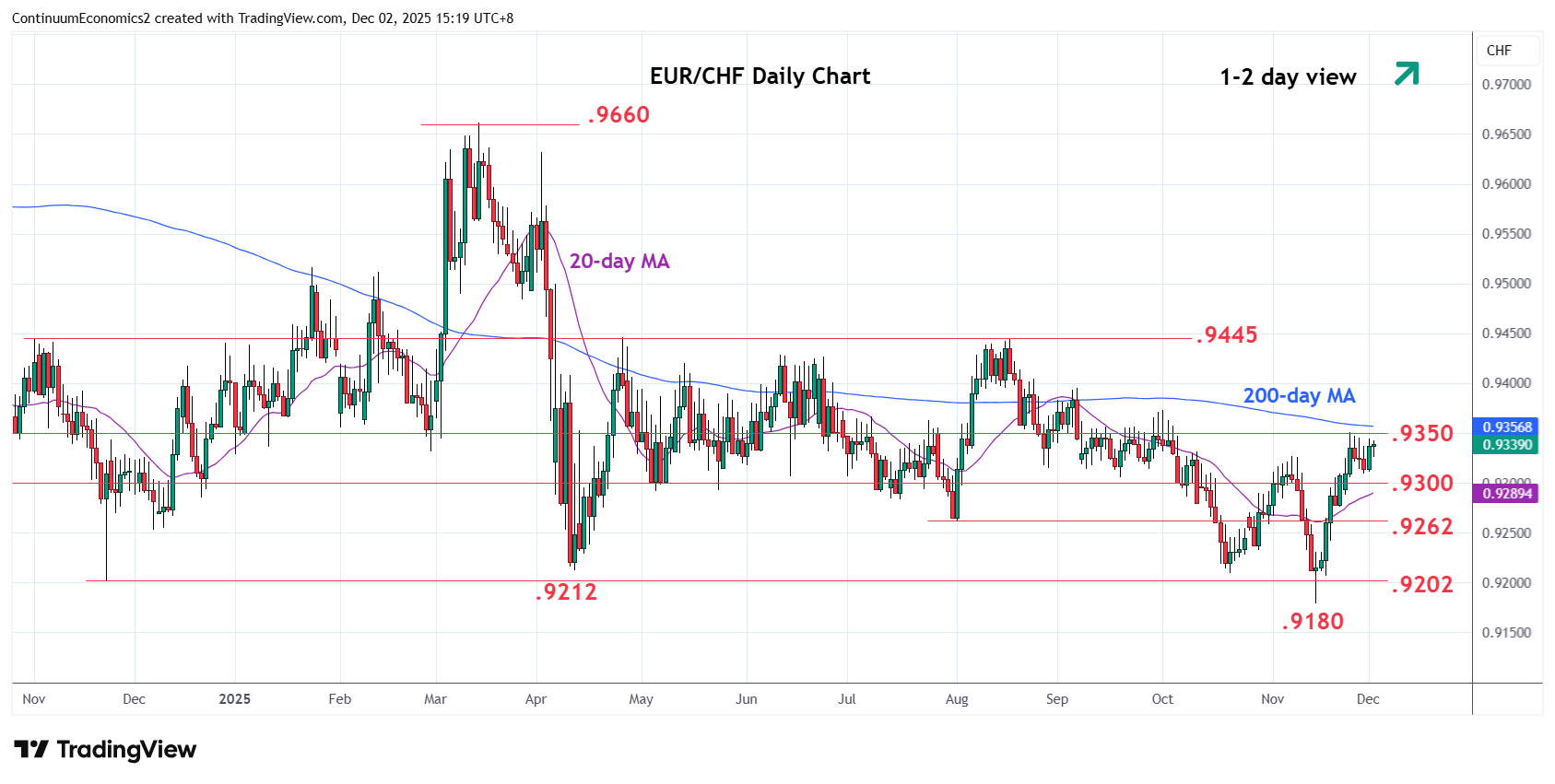 We also have Swiss CPI for November, with a 0.1% decline expected on the month and a 0.1% rise y/y. The CHF has fallen back against the EUR in the last couple of weeks after a brief EUR/CHF test below 0.92 on November 14, and still has potential to weaken further if EUR sentiment remains positive. The protection below 0.92 may be quasi-official, and the high level of the CHF is hard to justify given the lack of yield and the apparent strong support. A dip in y/y inflation into negative territory could yet trigger negative rates from the SNB once again, but this still looks unlikely. A weaker CHF would be a much preferred solution to excessively low inflation.