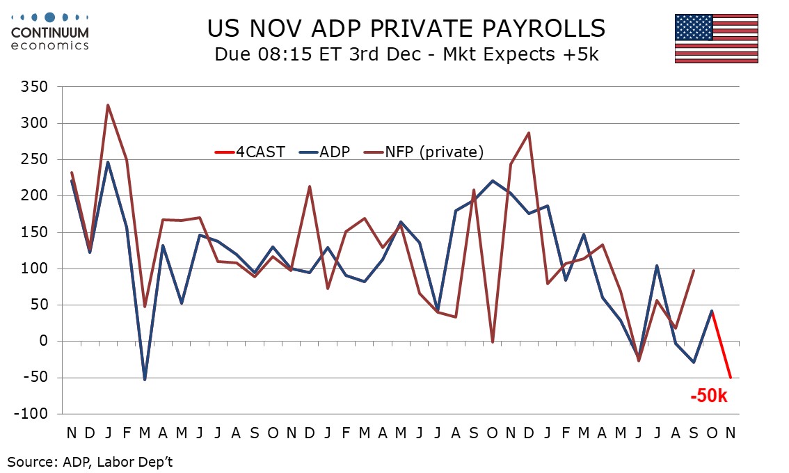 US ADP employment will be the main market focus on Wednesday. Weekly ADP data, showing an average weekly job loss of 13.5k in the four weeks to November 8, suggests a weak monthly report from ADP, covering the four weeks to November 15. We expect a decline of 50k. ADP data covers only the private sector. Weekly initial claims have been fairly stable but continued claims have been trending higher, which together can be seen as consistent with a slight decline in employment, with limited layoffs slightly exceeding limited hiring. Our forecast is notably weaker than the market consensus which looks for a 7k rise, and could be expected to trigger a significant USD dip. Even though the ADP report isn’t fully trusted as an indicator for the official employment report, it is of greater significance given the delays to official data.