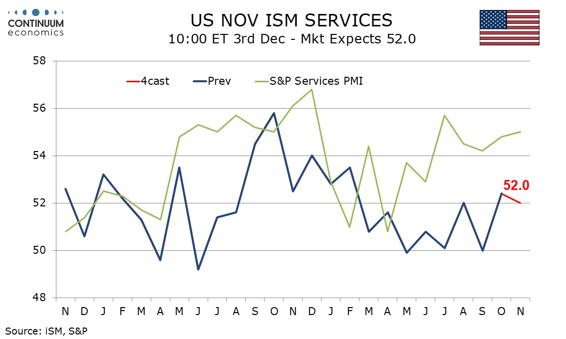 There is also the ISM services survey, which is typically seen as more significant than the manufacturing index, given the relatively large size of the services sector. We expect November’s ISM services index to correct lower to 52.0 from 52.4 in October which was the highest reading since February. The last twelve readings have seen the index move in the opposite direction to the preceding month. However, this is in line with the consensus and is less likely to have an impact than the ADP data.