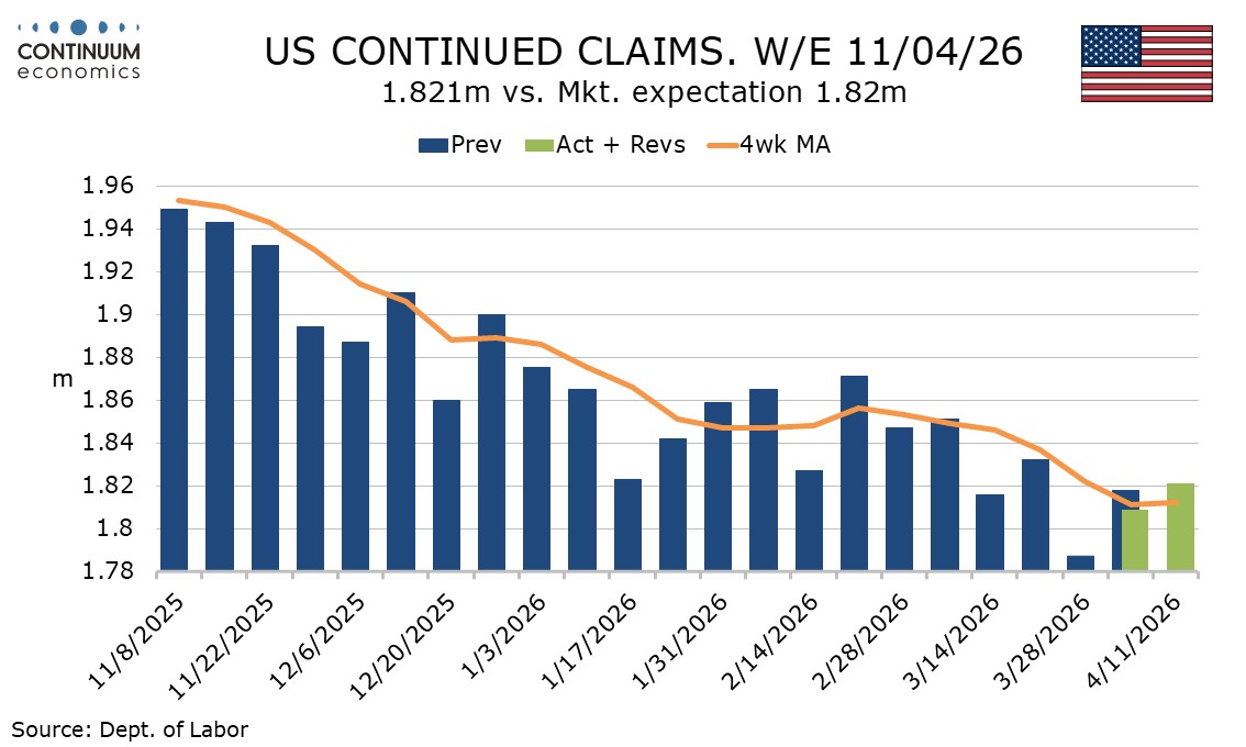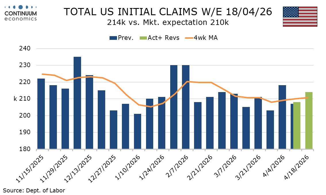 Initial claims at 214k are up from 208k and slightly higher than expected, in data that covers the survey week for April’s non-farm payroll. Trend however remains subdued.