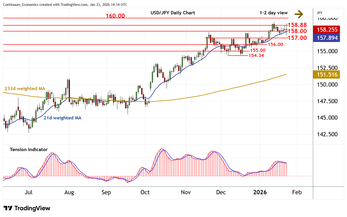 13:40 GMT - The anticipated test above the 158.88 year high of 10 January 2025 has been pushed back in highly volatile JPY-driven trade, with prices reaching 157.30/35 before bouncing into consolidation around 158.25. Intraday studies have turned down and daily readings are mixed/negative, suggesting room for fresh losses in the coming sessions. A close below 158.00 will add weight to sentiment and open up congestion around 157.00. But mixed weekly charts should limit any initial tests in fresh consolidation. Meanwhile, a close above 158.88 would improve sentiment and extend multi-year gains beyond the 159.45 current year high of 14 January towards 160.00.
