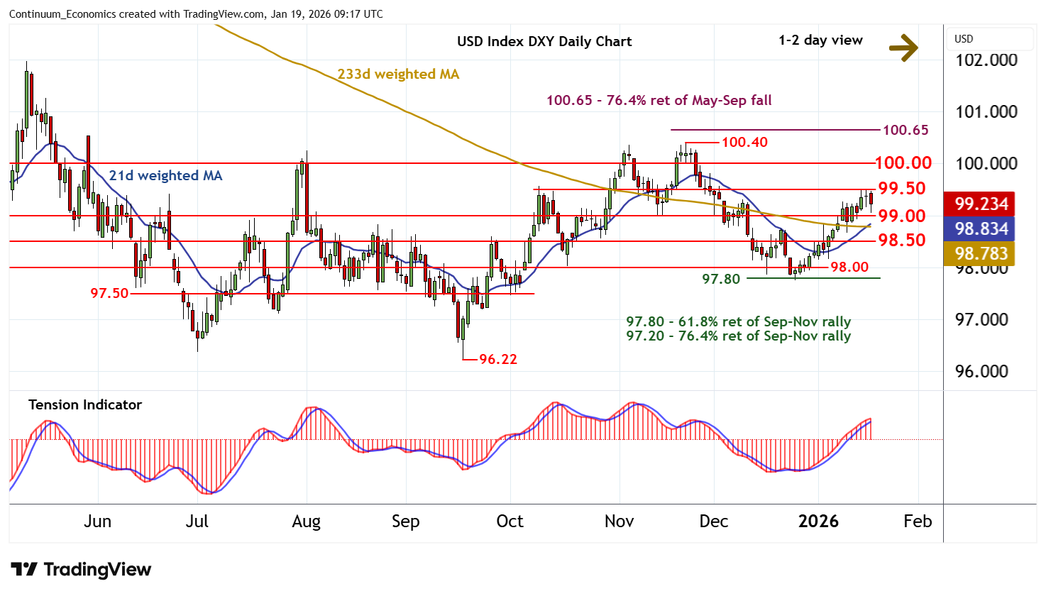 09:05 GMT - Consolidation following the test of resistance at 99.50 has given way to a choppy pullback, with prices currently balanced around 99.15. Negative intraday studies and a tick lower in overbought daily stochastics highlight room for a test of congestion support at 99.00. But the positive daily Tension Indicator and mixed weekly charts are expected to limit any immediate break in renewed consolidation above further congestion around 98.50. Meanwhile, resistance remains at 99.50. A break above here, if seen, should be limited in profit-taking towards congestion around 100.00.