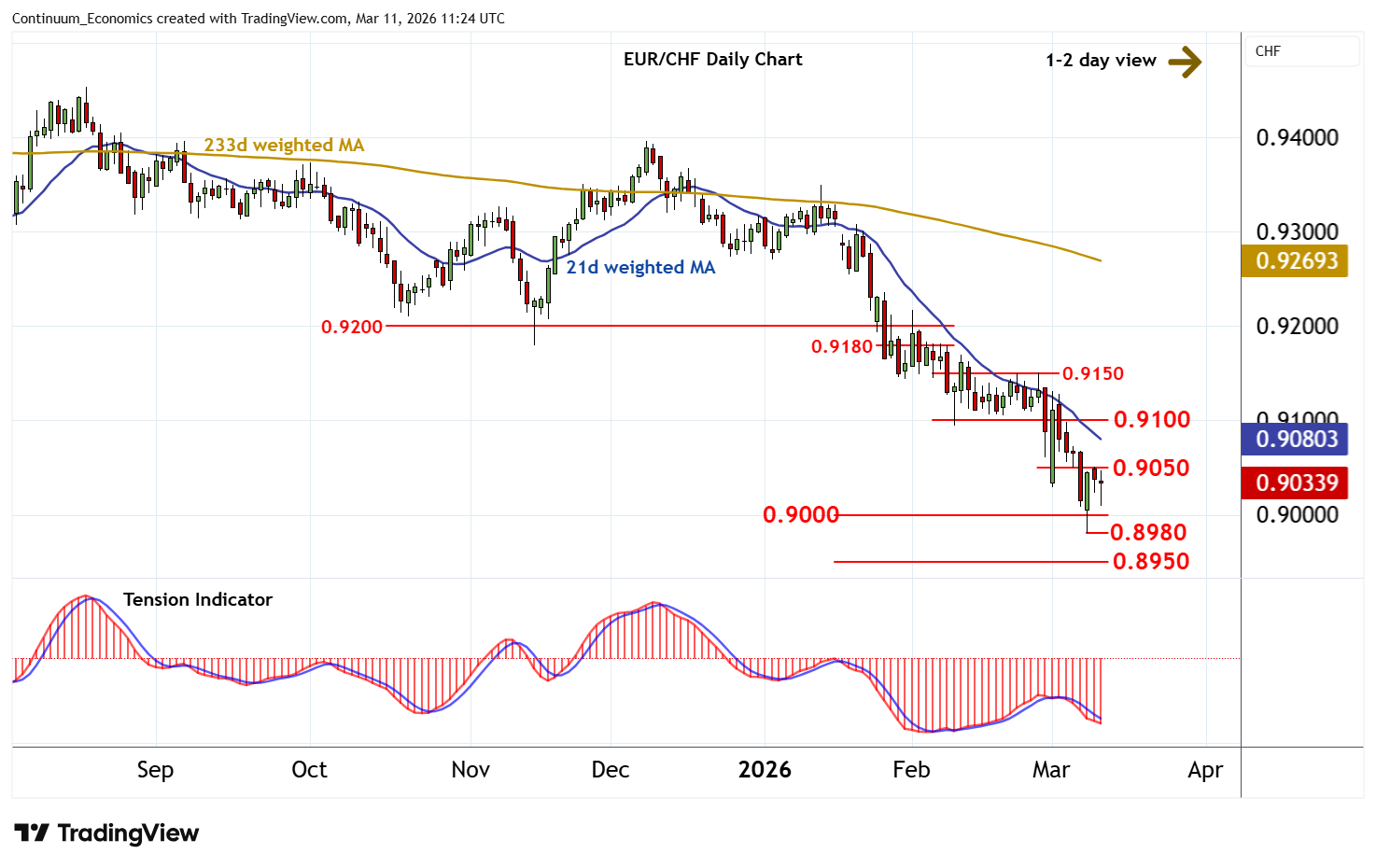 10:55 GMT - Little change, as prices extend cautious trade within the 0.9000 - 0.9050 range. Intraday studies have turned down, suggesting room for a test lower towards support at 0.9000. But rising daily readings should limit any initial tests beneath here in renewed consolidation above critical support at the 0.8980 current year low of 9 March, before negative weekly charts prompt further losses. A close beneath here will turn sentiment negative and extend long-term bear trends, initially to 0.8950. Meanwhile, a close above resistance at 0.9050, if seen, should be limited in renewed selling interest/consolidation beneath 0.9100.