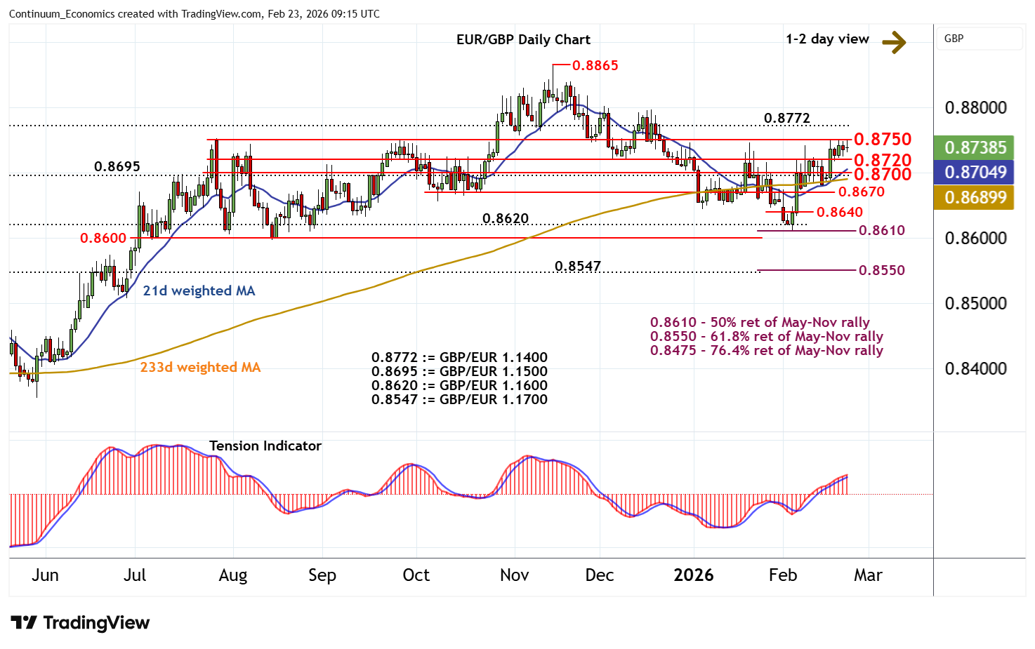 09:10 GMT - Little change, as mixed intraday studies keep near-term sentiment cautious and prompt choppy trade within the 0.8720 - 0.8750 range. Daily readings continue to rise, highlighting room for a test above congestion resistance at 0.8750. But the flat/negative weekly Tension Indicator and deteriorating longer-term charts should limit scope in selling interest towards 0.8772, (GBP/EUR 1.1500). Meanwhile, any immediate tests below congestion support at 0.8720 should be limited in consolidation above support at 0.8695, (GBP/EUR 1.1500), and congestion around 0.8700.