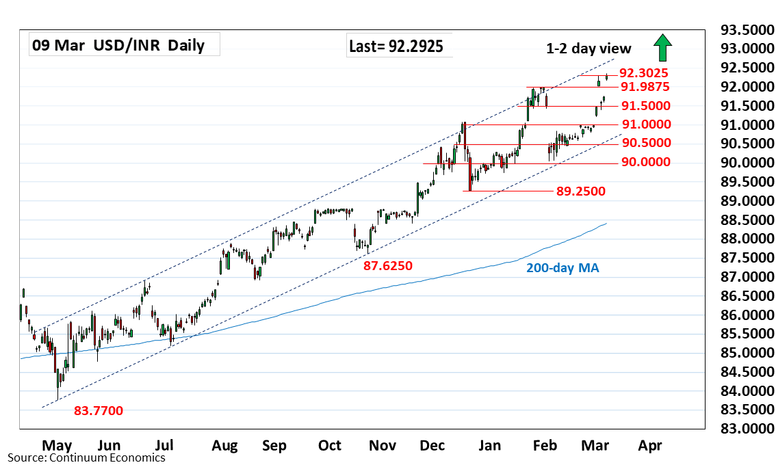 05:10 GMT - Pop higher at the open above the 92.0000 level has seen gains above the 92.3025 high of last week to reach fresh high at 92.3425. Pressure remains firmly on the upside and break here will see room to further extend the underplying bull trend to the 92.5000 projection target. However, overbought daily studies caution corrective pullback with support raised to the 91.9875 late-January high. Below here will ease the upside pressure and see room for pullback to support at 91.4025 and strong support at 91.0750/91.0000, December 2025 year high and congestion area.