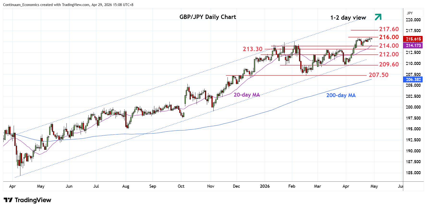 07:15 GMT - Consolidating test of the 216.00 level as prices unwind overbought daily studies. However, pressure remains on the upside and further gains within the bullish channel from the April 2025 year cannot be ruled out. Higher will see room for extension to resistance at 217.60, January 2008 year high. Overbought daily and weekly studies caution corrective pullback with support raised to the 215.00/214.00, congestion area and 17 April low. Would take break here to ease the upside pressure and see room for deeper pullback to retrace gains from 207.50 February current year low.