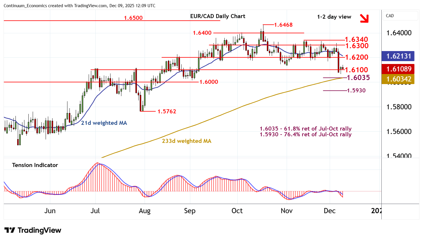 11:40 GMT - The break below 1.6100 has bounced from 1.6065, with prices currently balanced in cautious trade above 1.6100 as rising intraday studies flatten. Daily readings are under pressure and broader weekly charts are negative, highlighting room for fresh losses in the coming sessions. A close back below congestion support at 1.6100 will open up the 1.6035 Fibonacci retracement. However, already oversold daily and weekly stochastics could limit any initial tests in consolidation, before prices extend October losses still further. Meanwhile, resistance is lowered to congestion around 1.6200. An unexpected close above here will help to stabilise price action and prompt consolidation beneath further congestion around 1.6300.